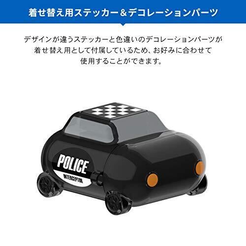 【ミニカーデザイン】 本体カラーとステッカーデザインで、タクシーやポリスカー、レーシングカーなどお好きなデザインにカスタマイズできます。デザインが違うステッカーと色違いのデコレーションパーツが着せ替え用として付属しています。