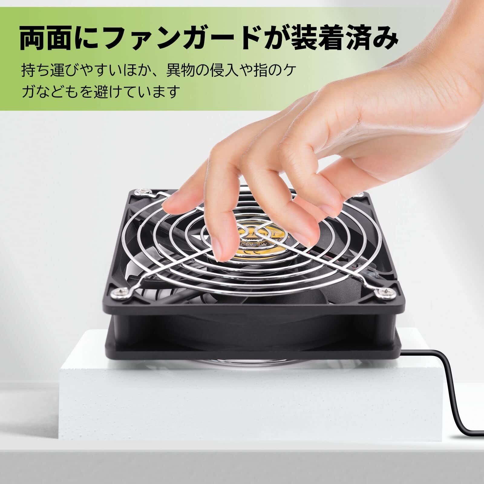 USB冷却ファンの両側に金属製ファンガードが装着済み、指が入らず、持ちやすくなります。また、ケーブルなど異物の侵入も防止できます。