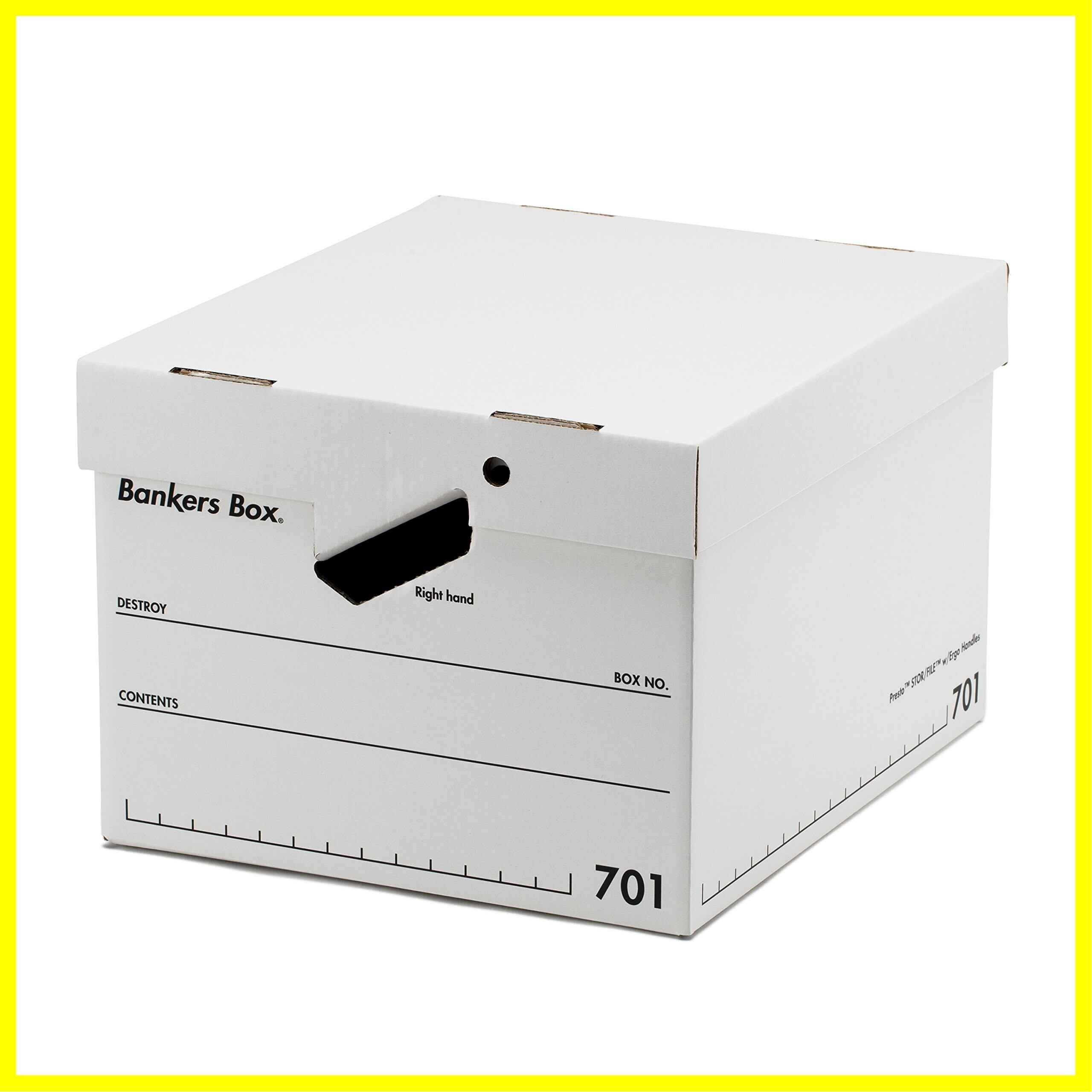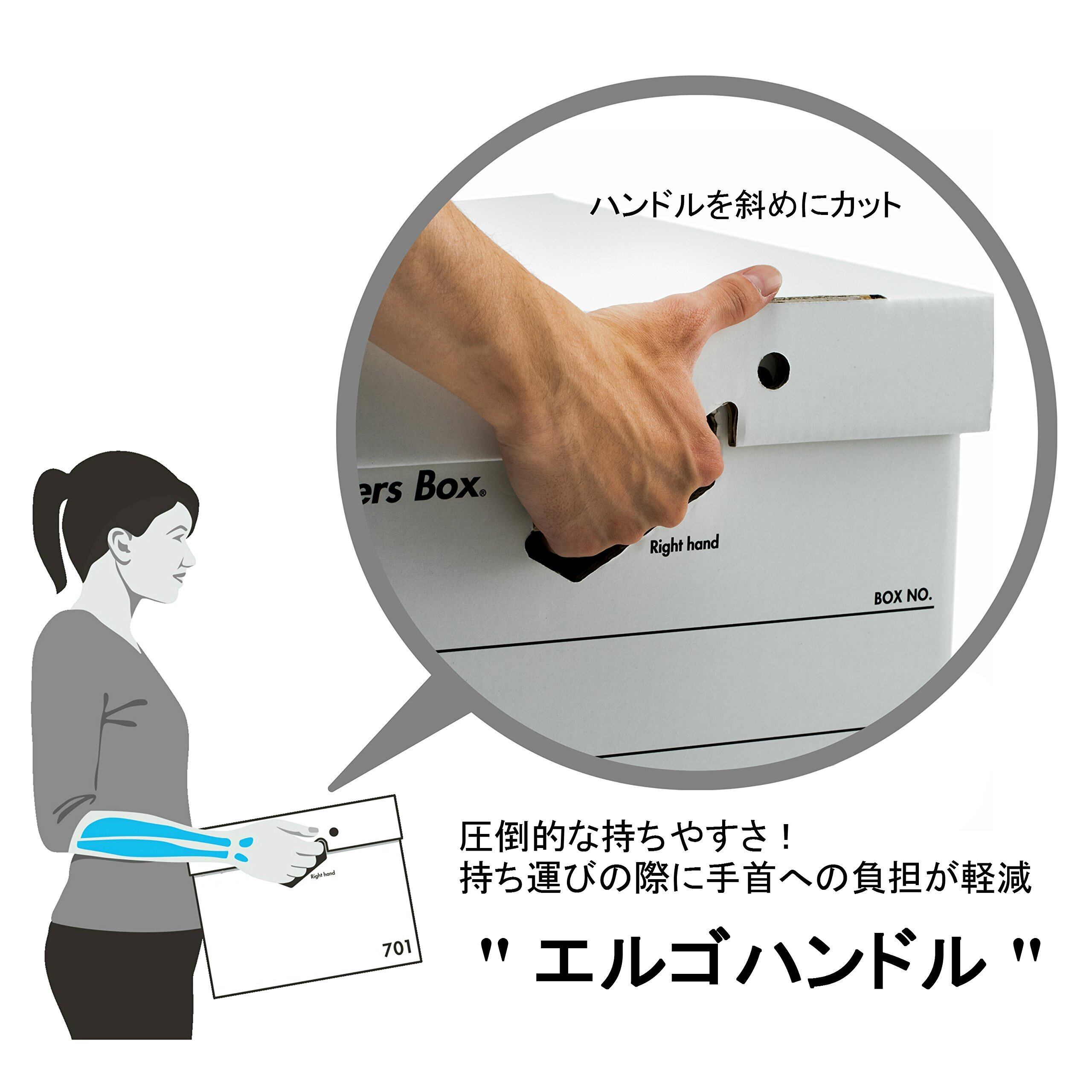 703ボックスの2倍以上の耐荷重性能を誇るバンカーズボックスシリーズのフラッグシップモデルで、たった1秒で本体の組み立てを可能にする"Presto(TM)"を採用しています。斜めにカットされたユニークな"エルゴハンドル"は持ち運びの際に手首への負担を軽減し、圧倒的な持ちやすさを実現しました。ハンドル横の結束バンドホールは運搬時のフタ落下を防ぐだけでなく、中長期での保管に最適なセキュリティの役割を果たします。