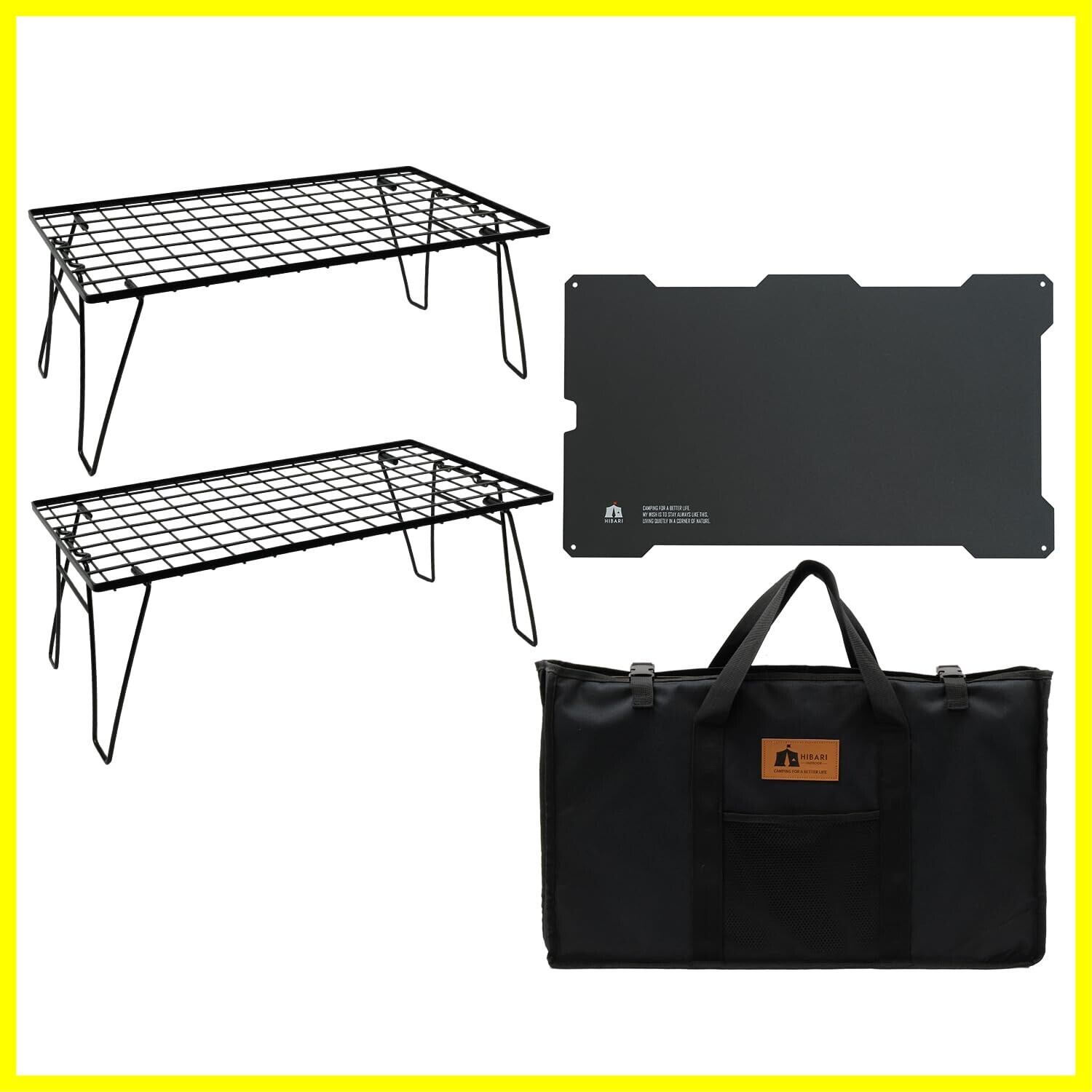 HIBARI フィールドラック キャンピングラック アルミ天板セット 収納ケース付き マットブラック キャンプ収納 コンパクト アウトドアワゴン アウトドアテーブル 折りたたみ テーブル ローチェアアウトドア キャンプテーブル おしゃれ 軽量 (ラック2枚+天板1枚セット)