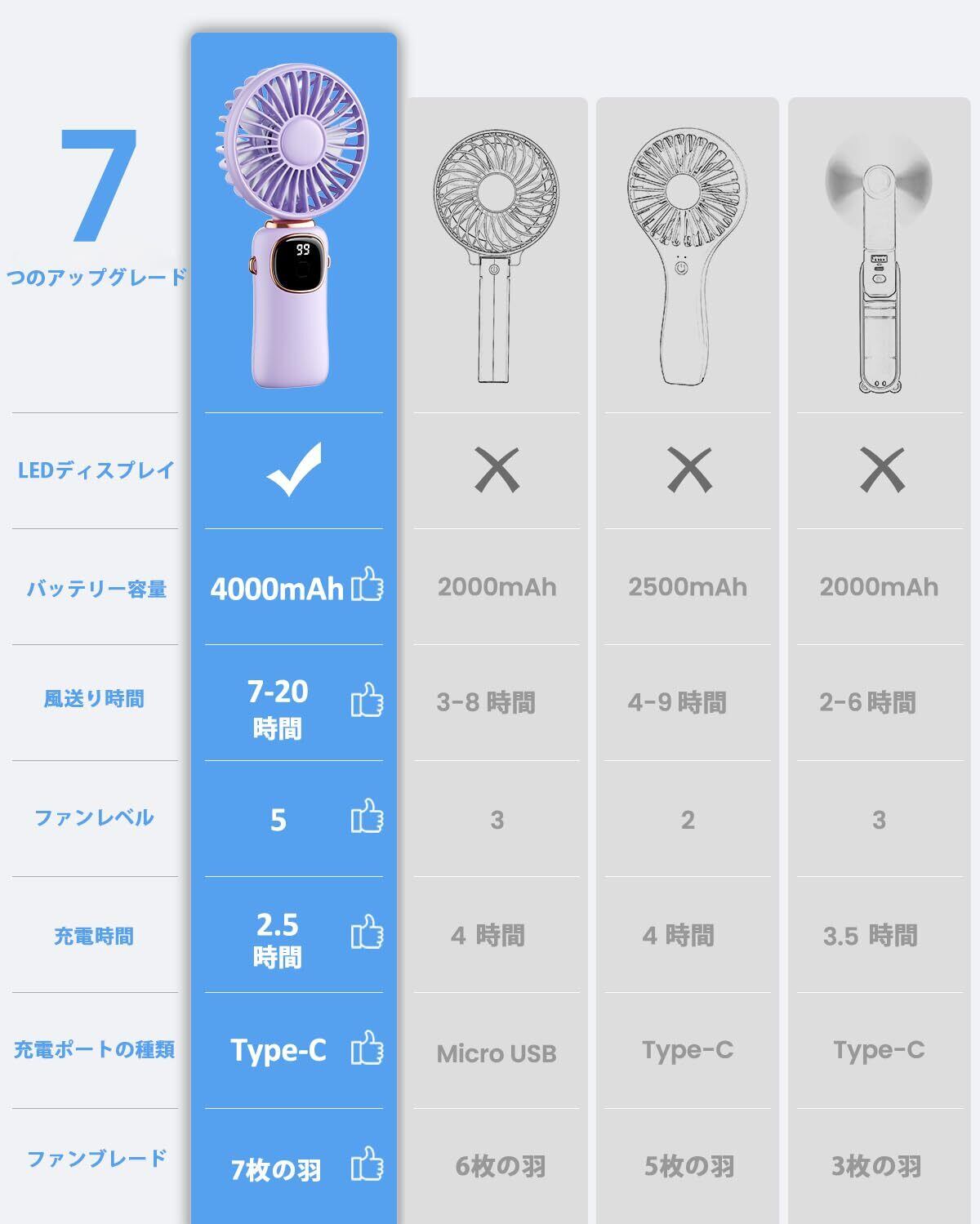 2024 ハンディファン 5段階風量 LEDディスプレイ coldSky ハンディファン 携帯扇風機 ハンディ卓上扇風機 手持ち扇風機 小型 静音 4000mAh 超強風 手持ち首掛け 卓上 扇風機 Type-C充電 軽量 小型 持ち運び便利 熱中症対策 ストラップ付き(パープル)