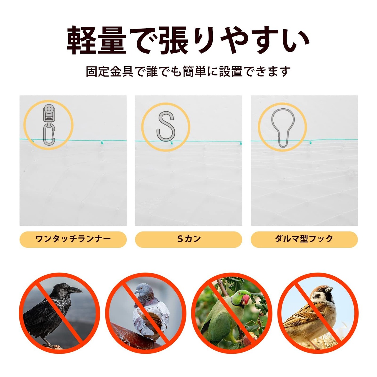 [15mm細かい網目 ほとんどの害鳥に対応可能] 15mmの極細網目を採用し、ハトやカラスなど大型な鳥類はもちろん、スズメなど小さな鳥たちもしっかり避けます。ネットが15mm目以上の場合、スズメなどの小型な鳥類は網目を通りぬける可能性がありますので、ご注意ください。