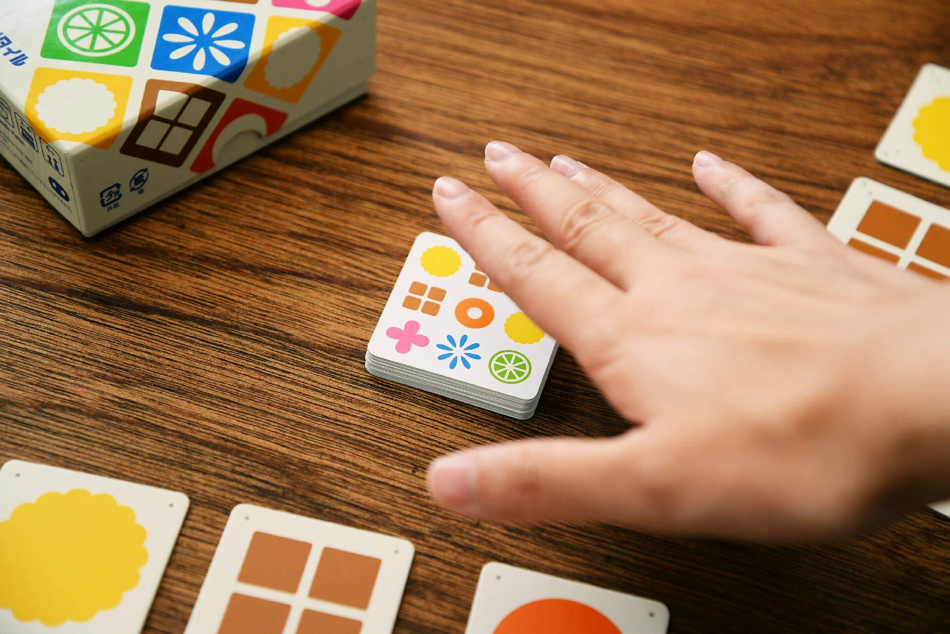 それぞれの手元にある、9枚のタイルを自由に動かしたりひっくり返したりして、誰よりも早くお題どおりに並べるだけ。ルールは簡単ですが、タイルの裏表の組み合わせをよく考えないとうまく揃いません。子供から大人まで楽しめる、スピーディなパーティパズルゲームです。