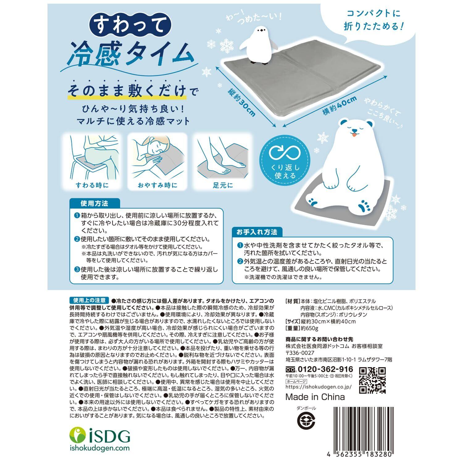 すわった瞬間ひんやり!マルチに使える冷感マット。 そもまま敷くだけでひんや~り気持ち良い! やわらかくて快適なすわり心地 コンパクトに折り畳めるので、アウトドアでの持ち出しにも便利! 勉強や仕事中・運転中の座席に敷いての使用がおすすめです。 さらに、おやすみ時や、足元などにもお勧めです。 くり返し使えます。