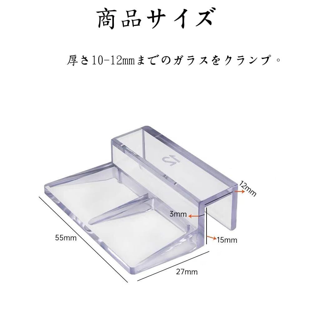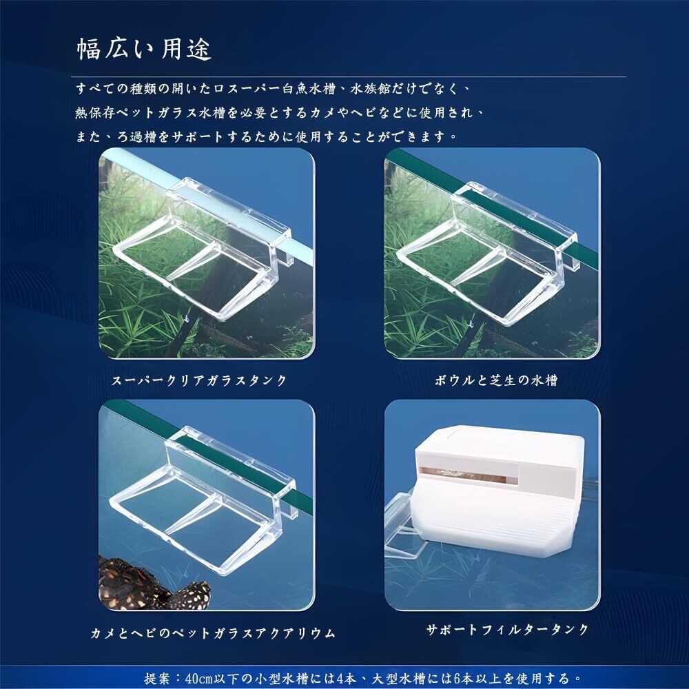 1.【水槽蓋クリップ】水槽の縁にセットするだけのシンプルな構造です。お使いの蓋の長さが足りない場合にもお使いいただけます。あらゆる種類のオープンフィッシュタンクやペットボックスなどに使用できます。 2.【簡単な取り付け】適切な場所に8つのクリップを取り付けるだけで、水槽のカバーレールを簡単に固定し、日常の清掃やメンテナンスを行うことができます。 3.【サイズ】厚さ12mmまでの水槽ガラスに適しています。あらゆるタイプの水槽蓋ホルダー、水槽に適しています。 4.【高品質素材】高品質のアクリル素材を採用し、安全で耐久性があり、丈夫で耐久性があり、透明度が高く、より美しいです。 5.【広く応用】幅広い適用範囲でさまざまなニーズに対応 この水槽スタンドは、さまざまなオープンタイプの水槽、草水槽、保温が必要な亀やヘビのガラス水槽などに対応します。小型から大型の水槽まで、適切な数のスタンドを選ぶことで、サポートのニーズを満たすことができます。