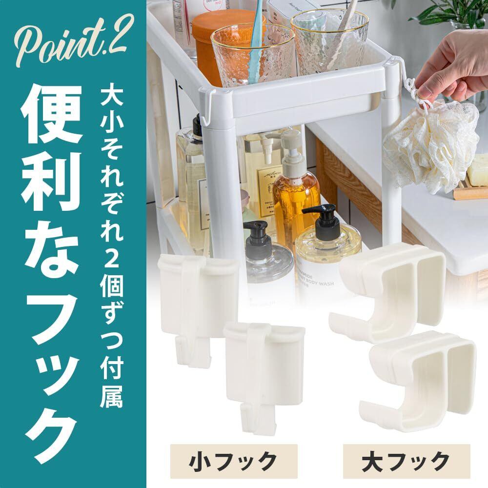 スポンジや掃除ブラシなどを吊り下げられる便利なフックが大小それぞれ2個ずつ付属します。
