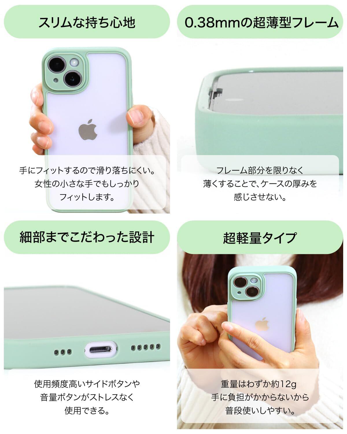 【スリムな持ち心地】:手にフィットするので滑り落ちにくく、女性の手でもしっかりフィットします。【0.38mmの超薄型フレーム】:フレーム部分を限りなく薄くすることで、ケースの厚みを感じさせません。【超軽量12g】:重量はわずか12gで重さを感じさせません。【柔らか素材で簡単着脱】:柔軟性があるフレームなのでケースの着脱が簡単にできます。