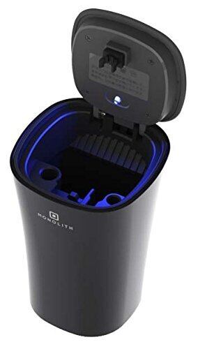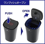 車のドリンクホルダーに収まる灰皿です。フタを押してワンプッシュで開けられます。インテリアになじむシンプル&スタイリッシュデザインです。夜間も見やすく使いやすいソーラーLEDライト付です。火消し穴の清掃ができるクリーニングスティック付。LED発光色:ブルー