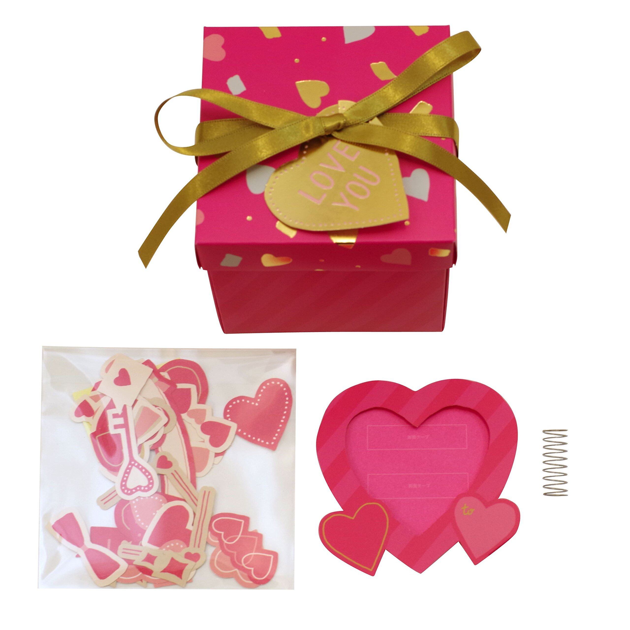 セット内容 :アルバムプレゼントボックス×1(フタ×1、台紙付き本体×1)、デコレーションフレークシール×28枚、ポップアップフォトフレーム×1(フォトフレーム×1、バネ×1、接着用両面テープ×2)
