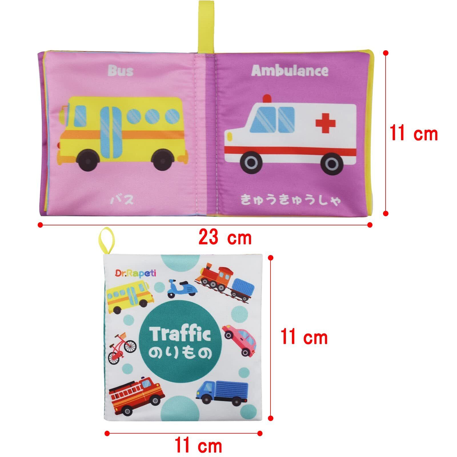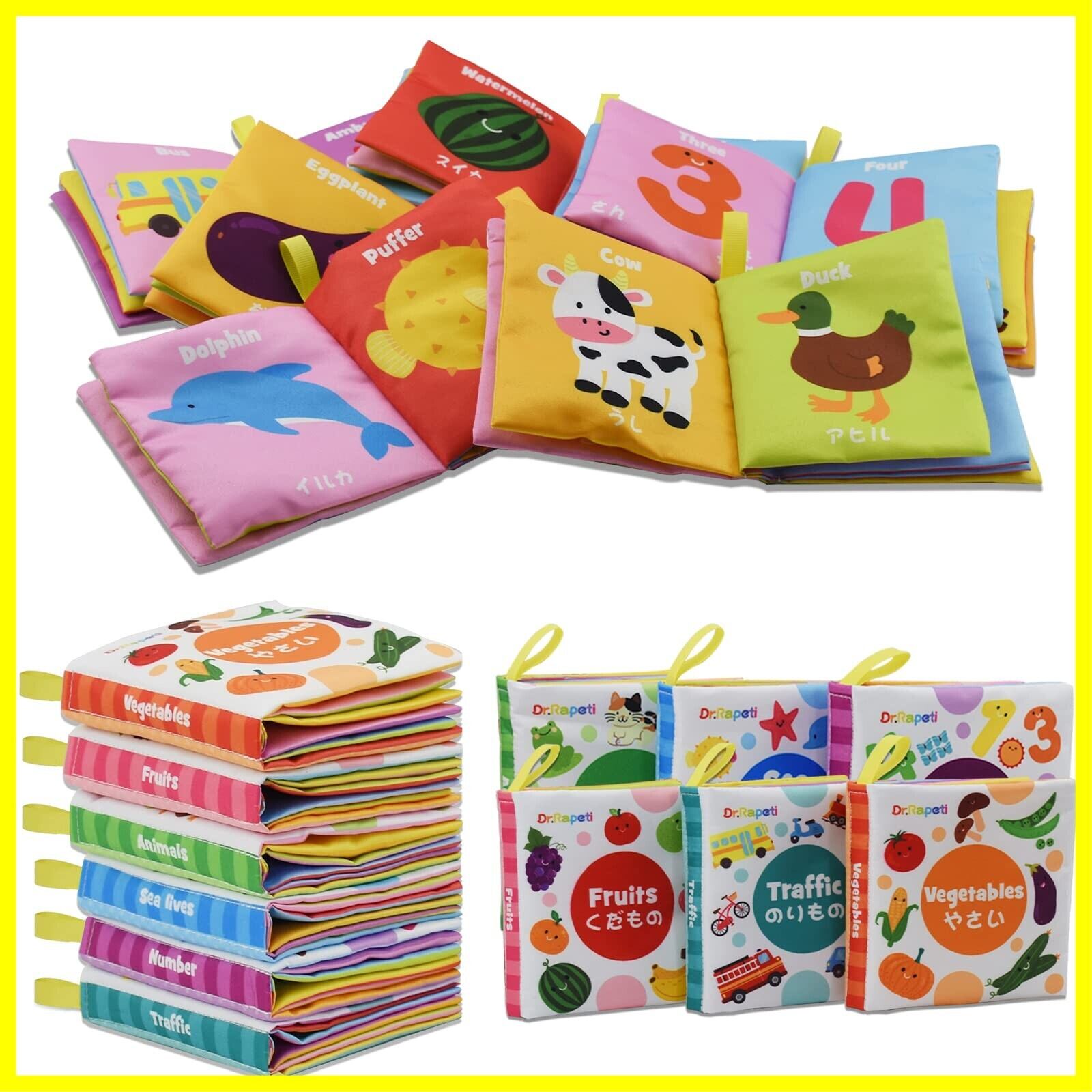 Dr.Rapeti 赤ちゃん布絵本 ベビーおもちゃ 日本語 イングリッシュ 二ヶ国語 6冊セット カシャカシャ音出る 鳴る笛 柔らかい 洗える お風呂に入れる 早期知育玩具 育児サポート 出産祝い プレゼント 幼児向け