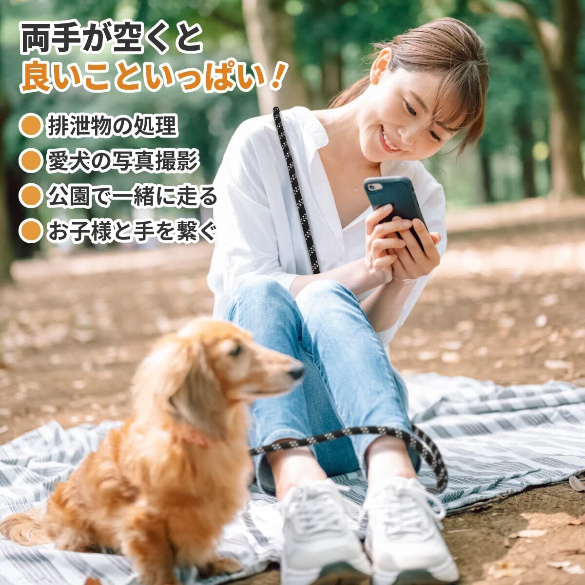 【飼い主目線の嬉しいポイント】■身体に通してもワンちゃんとの距離にゆとりがあり、歩きやすいです。■握りやすいハンドルで手が痛くなりにくいです。■伸縮性のあるリードにより、ワンちゃんの強い引っ張りを和らげます。■耐久性に優れたナイロン素材を採用し、劣化しにくく長い間ご愛用頂けます。■使いやすさにこだわったカラビナは、スムーズに脱着が行えます。■亜鉛合金製のナスカンは360度回転するため、ワンちゃんが動き回っても絡まりにくい仕様です。■リード本体には車などのライトに強く光る反射糸を織り込んでおり、早朝や夜間の散歩にもおすすめです。