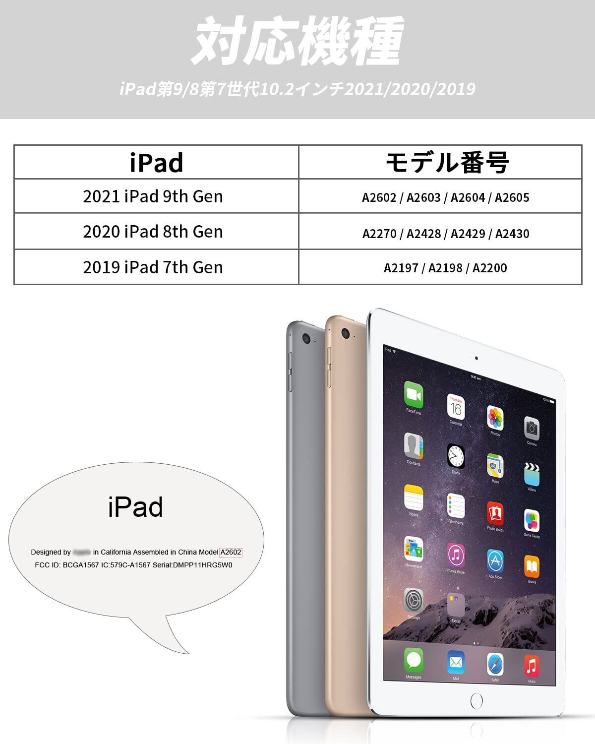 【対応機種】新型 iPad 10.2インチ 2021年発売モデル 第9世代 / 2020年発売モデル 第8世代 / 2019年発売モデル 第7世代 アイパッド (対応モデル番号 A2602 / A2603 / A2604 / A2605 / A2197 / A2198 / A2200 / A2270 / A2428 / A2429 / A2430) ご注意:iPad Pro、iPad Air、iPad Miniなどの他の機種には対応できません。