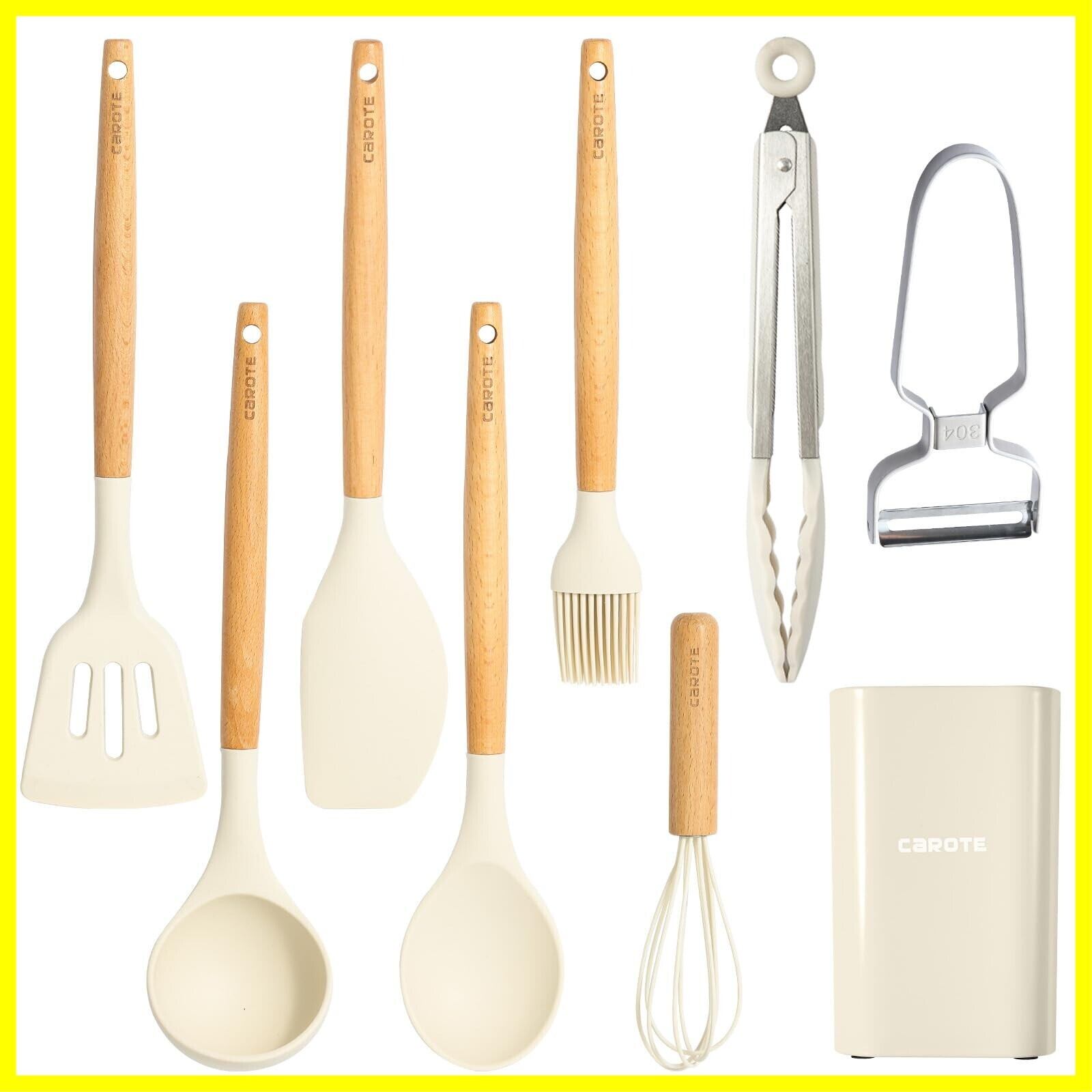 CAROTE カローテ キッチンツールセット9本 シリコン製 調理器具セット フライ返し おたま トング 泡立て器 へら ハケ スプーン浅 ピーラー ツールスタンド 高耐熱性 ベージュ(9点セット)