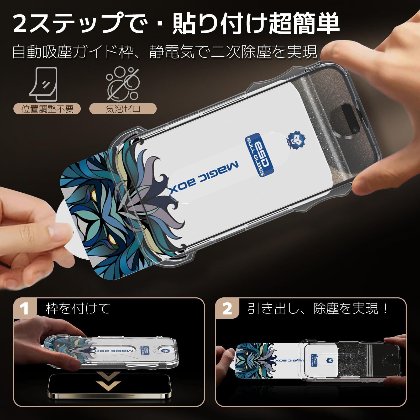 [自動吸塵ガイド枠・貼付簡単] iPhone 15 Pro Max ガラスフィルム(ガイド枠一体型、拭き取りシート付属)。ガイド枠とガラスが一体となっており、誰でも簡単にフィルムを貼ることができます。枠は自動位置決め機能と除塵機能付き。枠を画面上に置き、タブを引き出し、画面を押して気泡を取り除き、取り付けを完了します。ガイド枠の静電吸着機能により、スクリーンに残ったホコリを気泡を残さずに自動的に掃き出します。成功率100%!