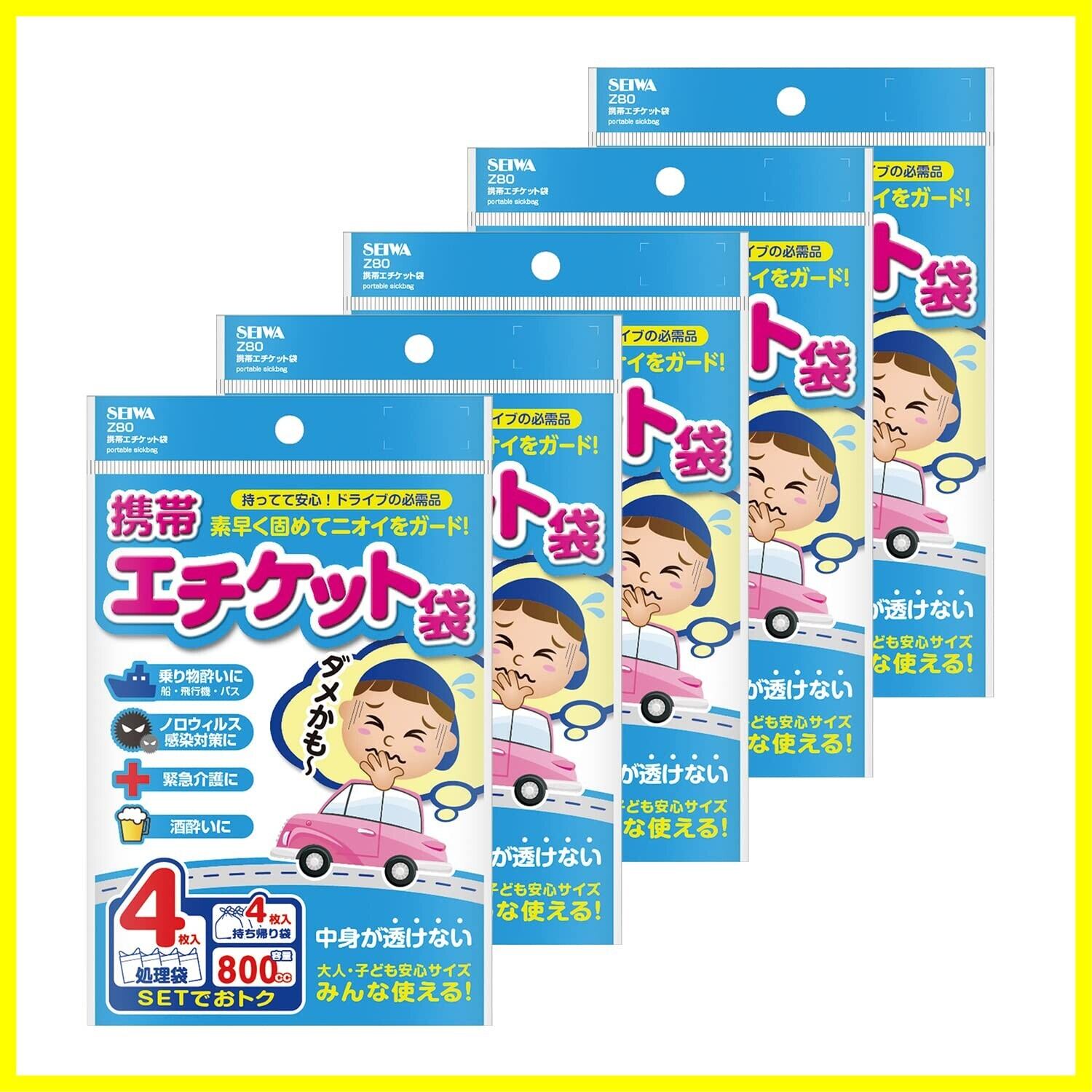 セイワ(SEIWA) 車内常備用品 携帯エチケット袋 4枚入×5個セット IMP156 持ち帰り袋付き800cc 旅行用 緊急 非常用 防災 災害 船酔い 高速 車酔い 嘔吐 ゲロ 長距離ドライブ エチケット袋 携帯トイレ としても使用可能