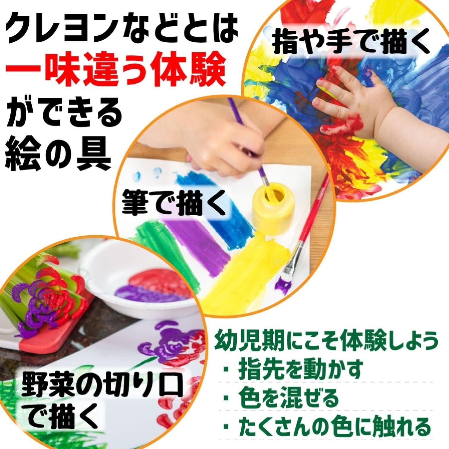 【商品概要】かわいいポット入りの10色の定番カラー。絵の具で筆を使ったお絵かきはもちろん、スタンプやスポンジを使用して、面白いパターンやデザインを制作できます。ウォッシャブルなので肌や衣類についても洗い流せます。