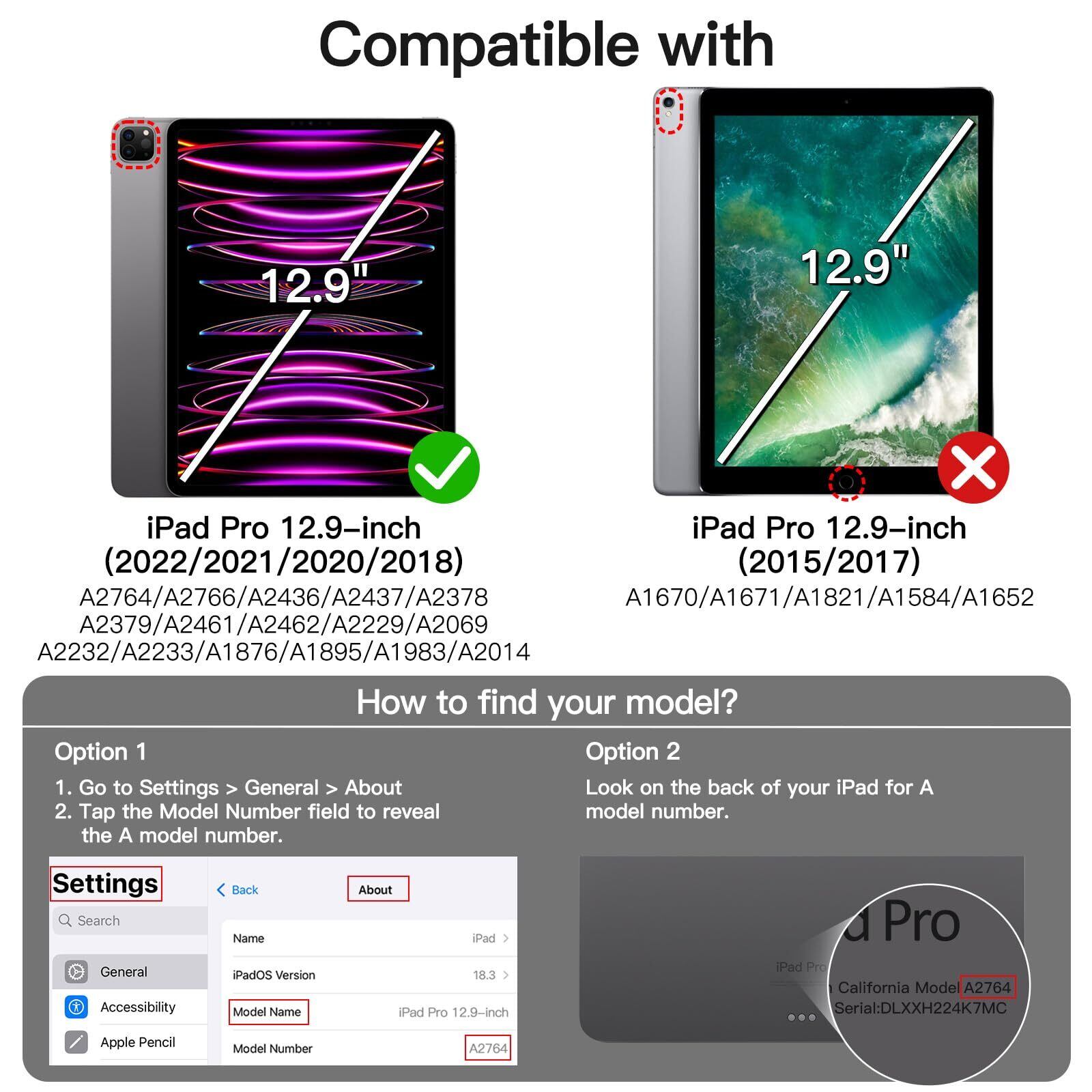 [互換性] iPad Pro 12.9インチ用(第6/5/4/3世代、2022/2021/2020/2018モデル用、第1/2世代、2015/2017モデルには対応しておりません)の特別デザインです。対応モデル:A2436 / A2764 / A2437 / A2766 / A2378 / A2379 / A2461 / A2462 / A2229 / A2069 / A2232 / A2233 / A1876 / A2014 / A1895 / A1983。おデバイスの裏面にあるモデル番号をご確認ください