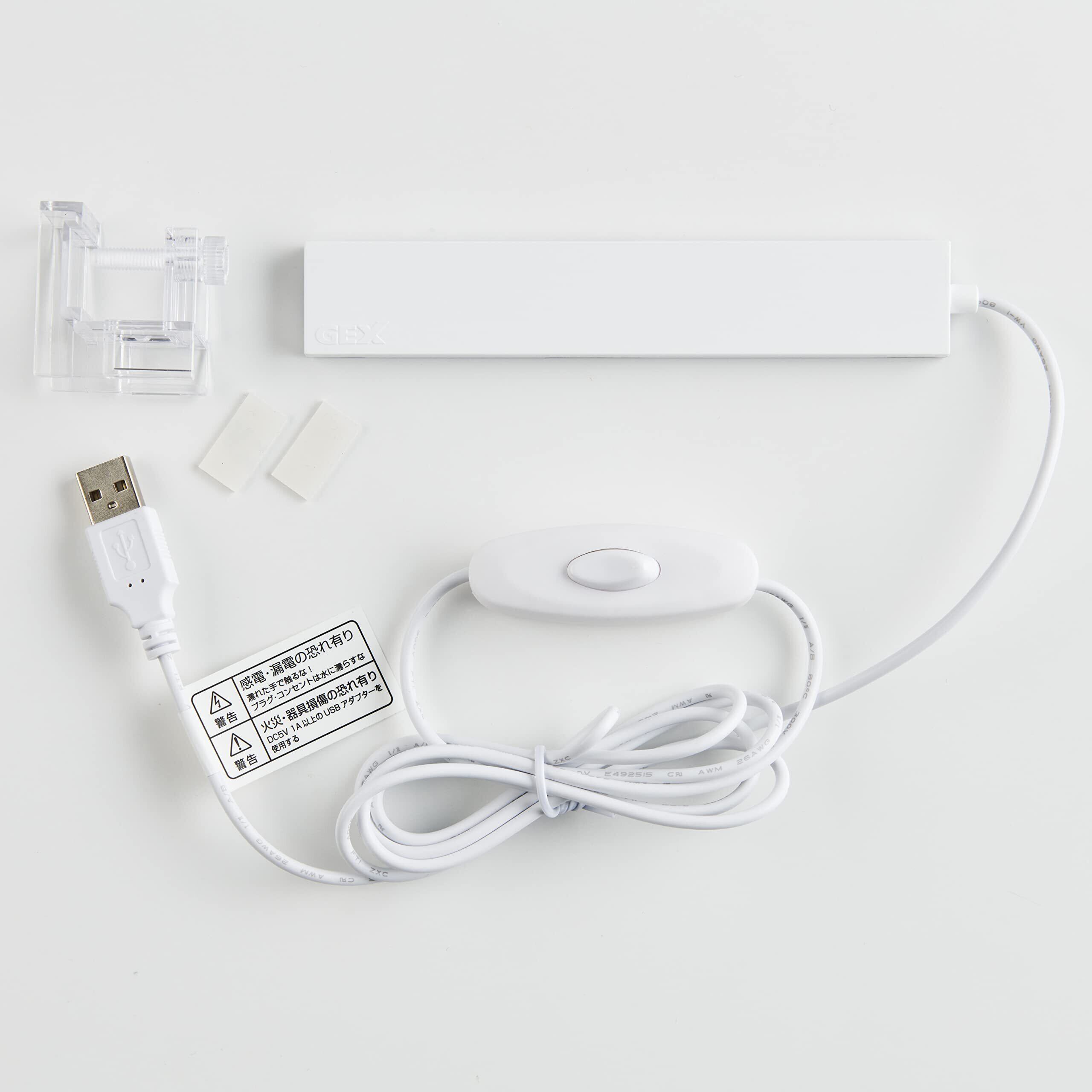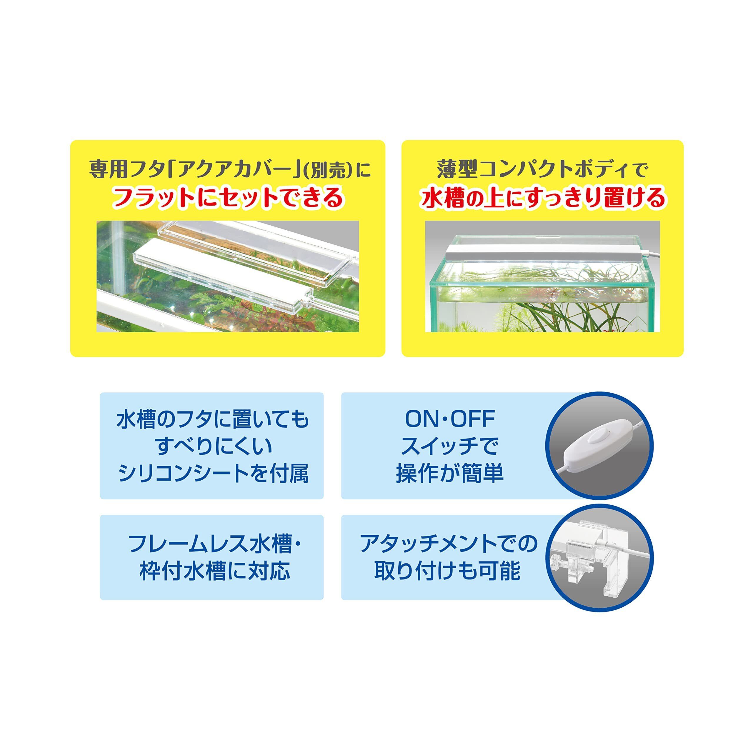 コンパクトで明るいスリム高輝度LED。厚さ8mm超コンパクトスリムボディ。水景を鮮やかに照らす自然の明るさで魚や水草を美しく魅せる。明るさ130lm、色温度6,800K、演色性Ra83。置き方自由自在!専用フタ「アクアカバー」(別売)でフラットにセット。水槽のフタに置いてもすべりにくいシリコンシート付で、フレームレス水槽にすっきり置ける。フレームレス水槽・枠付水槽に対応。コンパクト水槽用、幅40cm以下の水槽に最適。ON・OFFスイッチで操作が簡単。アタッチメントでの取り付けも可能。USB電源を採用。本製品にはUSBアダプターは付属していません。当社純正品(USBアダプターG-1A)もしくは市販のUSBアダプター(DC5V 1A以上)をお買い求めください。