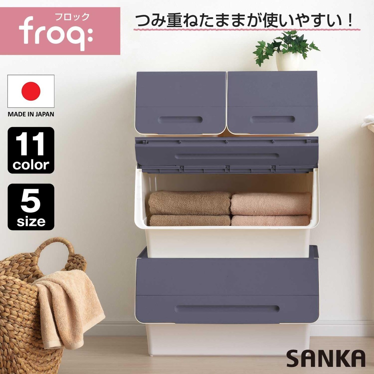 サンカ フロック 重ねて使える蓋付き衣装ケース サンド ネイビー おしゃれな大容量収納 引き出さずに使える前面開閉式 カパっとひらく固定できるフタ キャスター取り付け可能 日本製 衣類 収納ボックス (幅38.5×奥行46×高さ31cm) froq fr-30NV/WH