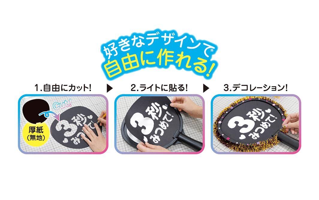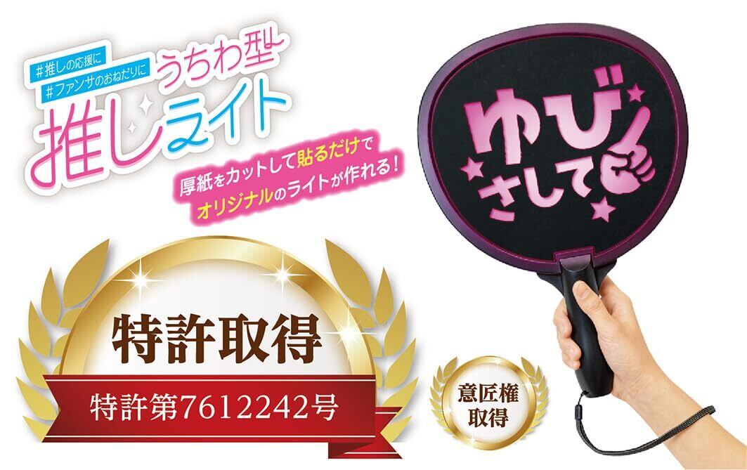 推しへの愛を伝えるメッセージが暗闇でくっきり光る推し活グッズの新製品『うちわ型推しライト』 ●本製品は、推しうちわとペンライトを合体させる発想から生まれた、文字が光るうちわ型のライトです。当社が独自開発した「推し文字くっきり発光パネル」(特許出願中)を採用 。うちわ表面の全体がムラなく美しく光ることで、文字が遠くからもくっきり良く見えます。 ●ライト機能は10色の推しカラーで光らせることができます。 両面を自由にデコレーションしてデザインをカスタマイズすることも可能です。 「推しうちわ×ペンライト」という発想から生まれた新しいアイテムで、推しに想いを届けてみませんか? ※参加されるイベントの規約を熟読の上、本製品を使用してください。