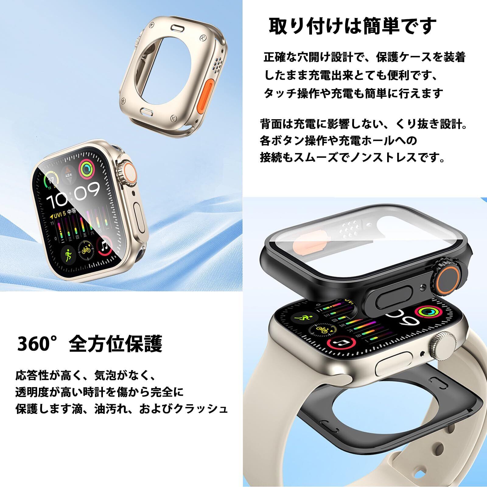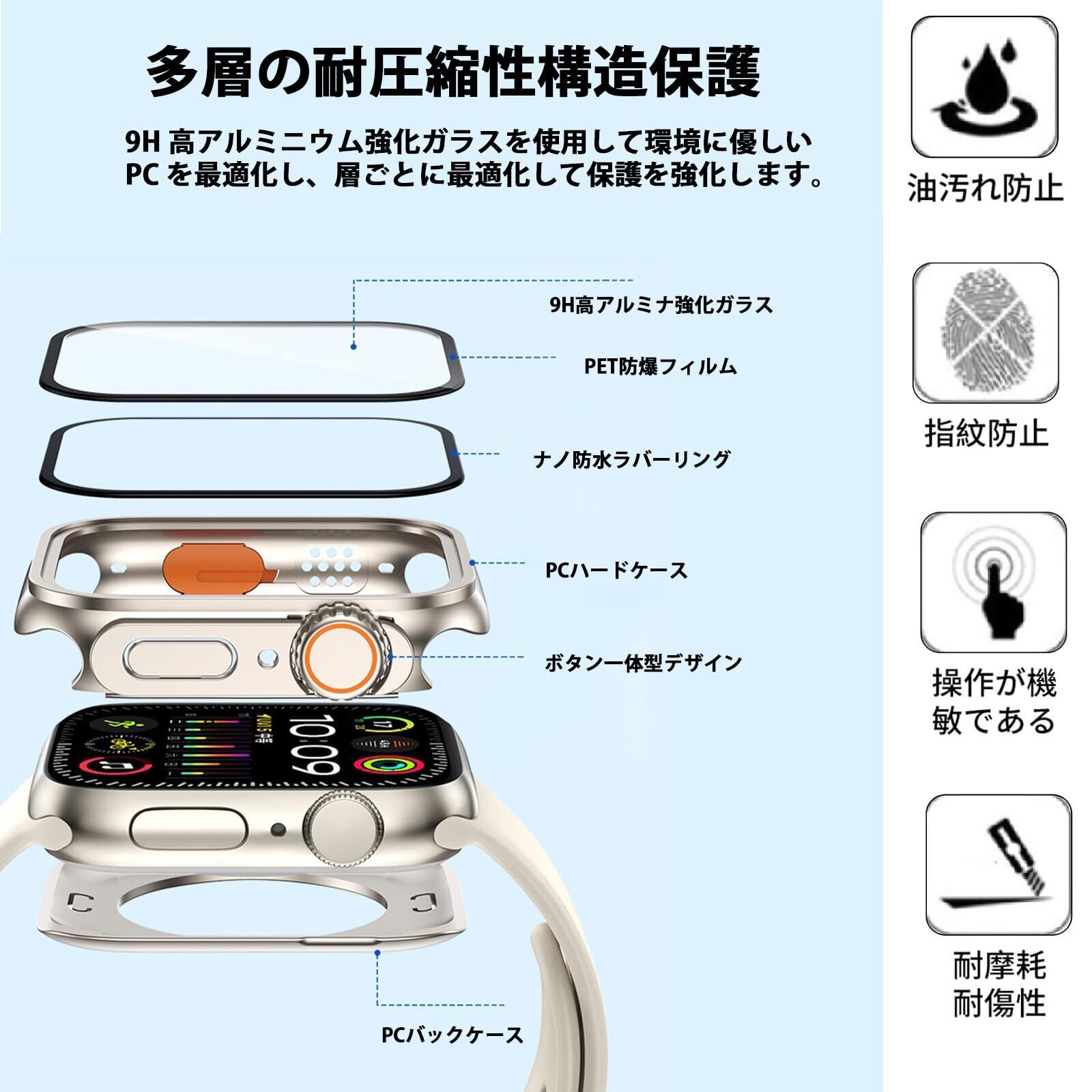 【高品質素材】Apple Watch カバーの液晶保護フィルムは硬度9Hの強化ガラスを採用しキズに強く耐久性があり、高解像度で高透過率、タッチもスムーズです、耐傷性、耐衝撃性に優れ。今までの保護ケースを基に改良し、防水機能が向上しました、カラーや見た目はUltraとほぼ同。