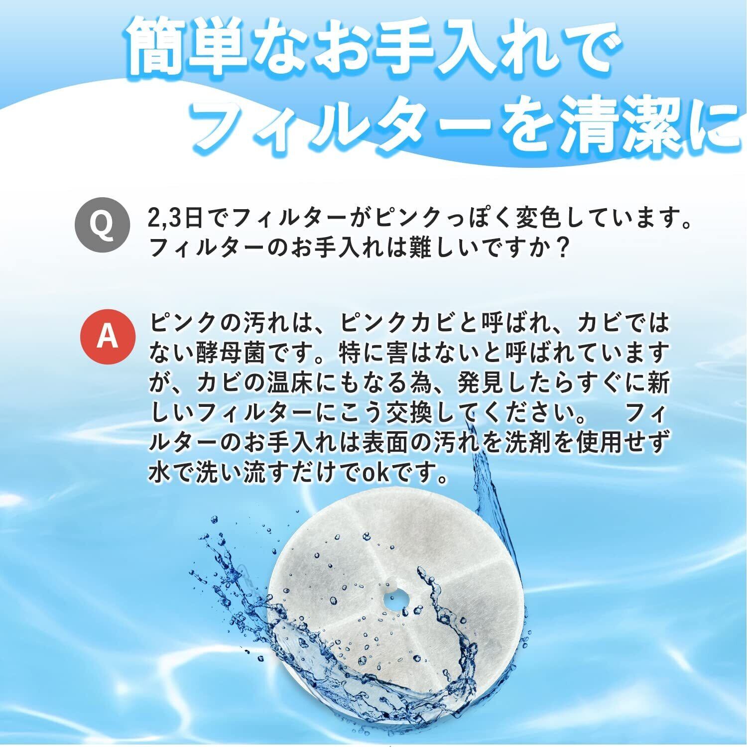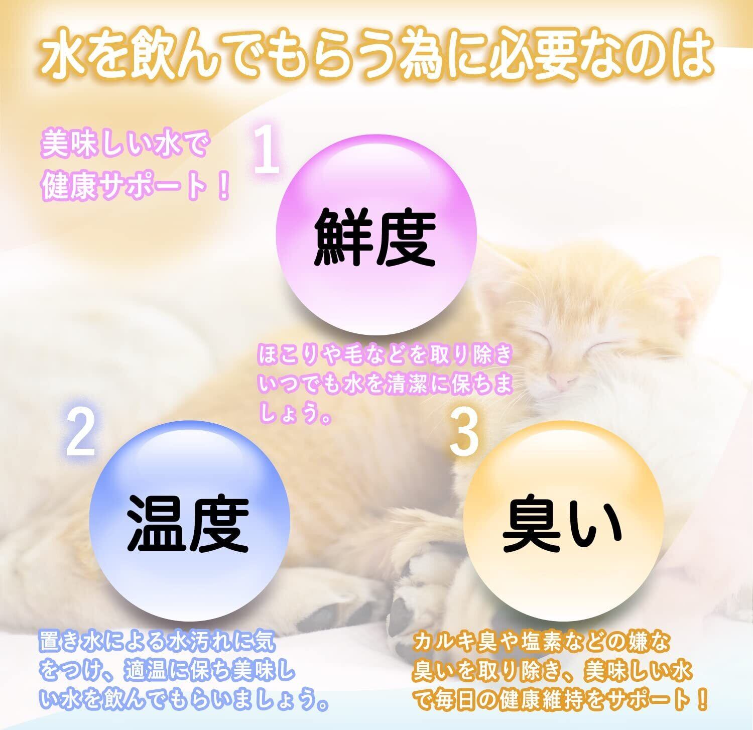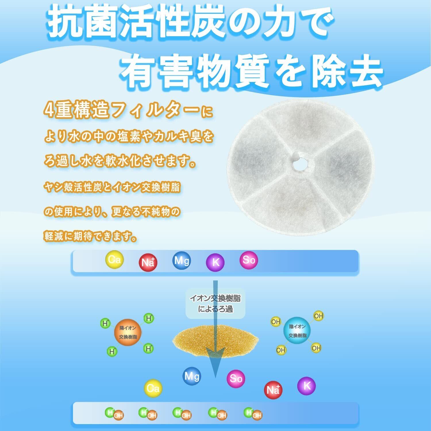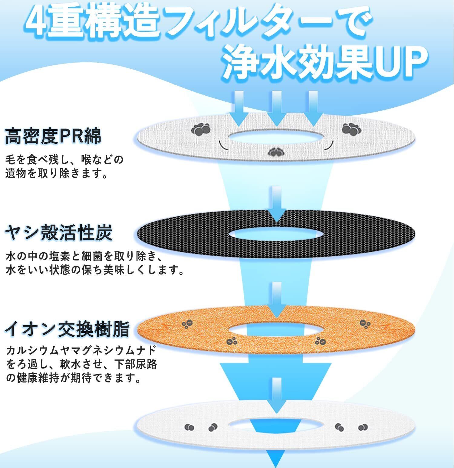 【4構造濾過システム】 浄水の仕組みは、正規品と同じ。お水をキレイにするのは、この4構造! ①初めのフィルターにて毛や食べ残しなどの沈殿物を濾過。 ②ヤシ殻活性炭:カルキ臭・細菌を吸着&除去。 ③イオン交換樹脂:マグネシウム等を除去して軟水化。 ④最後のフィルターにてサビなどの微粒子を除去。