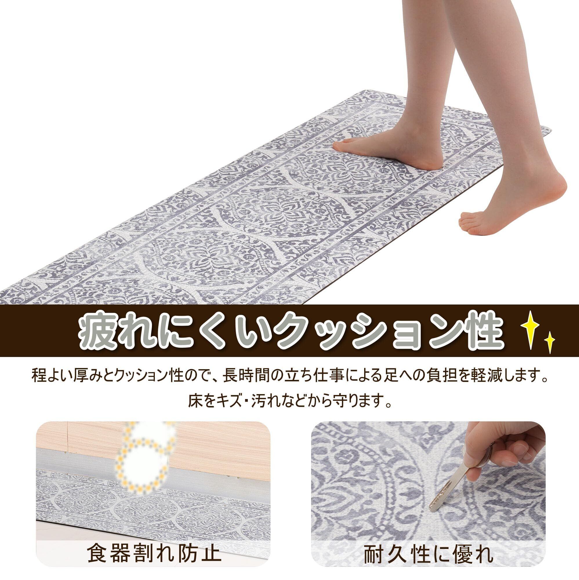 Ashmore キッチンマット 拭ける台所マ ット ずれない PVC 撥水 おしゃれ 滑り止め 抗菌 防炎 厚さ10mm お手入れ簡単 約45cm*240cm キリム グレー