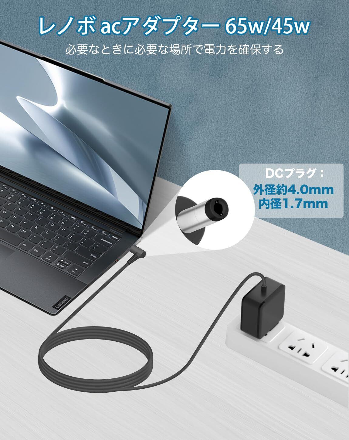 【商品規格】本製品は純正品ではなく、互換・交換用のACアダプターです。入力電圧: AC100V-240V~2A 50-60Hz 出力電圧: 20V 3.25A 65W (20V 2.25A 45Wと互換性あり);DCケーブルの長さ:1.8m ; DCプラグ:4.0x1.7mm ※ノートパソコン (65W & 45W、丸型コネクタ) に適合するように特別に設計されています。丸型電源コネクタをを備えたIdeaPad、Chromebook、Yoga、Flex、Miix ノートパソコン予備用や交換用電源アダプターとして最適です。