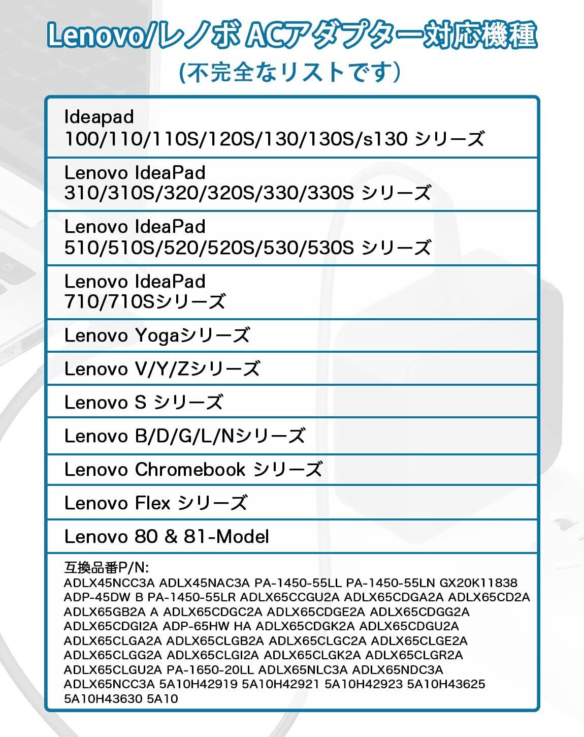 【対応機種】互換品番:ADP-45DW BA, ADP-45DW C, ADL45WCC; P/N : 5A10H42919, 5A10H42921,5A10H42923,5A10H42925,5A10H43625,5A10H43630,5A10H43632,GX20K11838,PA-1450-55LL,PA-1450-55LN,PA-1450-55LR,PA-1450-55LU,5A10H70353,ADLX45NCC3.Yoga 710-11ISK 710-11IKB 710-14IKB 710-14ISK 710-15ISK 710-15IKB, Ideapad 110 110S 120S 130 130S S130 310 310S 320 320S 330 330s 510 510s 520 520S 530 530S 710 710s Flex 14 14iwl Chromebook N22 N42 N23などのパソコン対応する。お使いのノートパソコンの充電ポートが丸型コネクタな形状で、使用電力が45W/65Wであれば、この充電器は互換性があります。