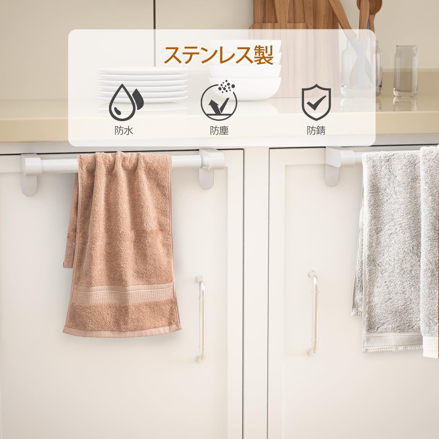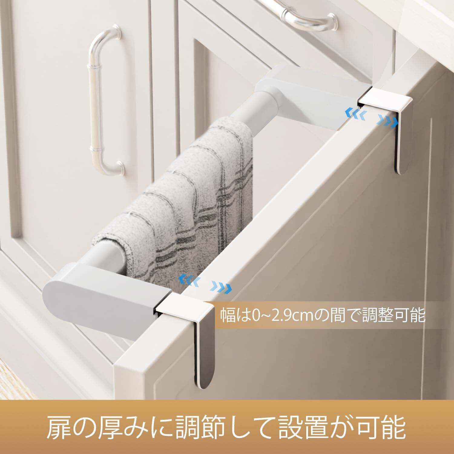 【伸縮可能なデザイン】タオルハンガーは伸縮式で、ニーズに合わせて調整できます。長さだけでなく幅も調節できます。さまざまなキャビネットの扉に対応できます。適用性が高い。