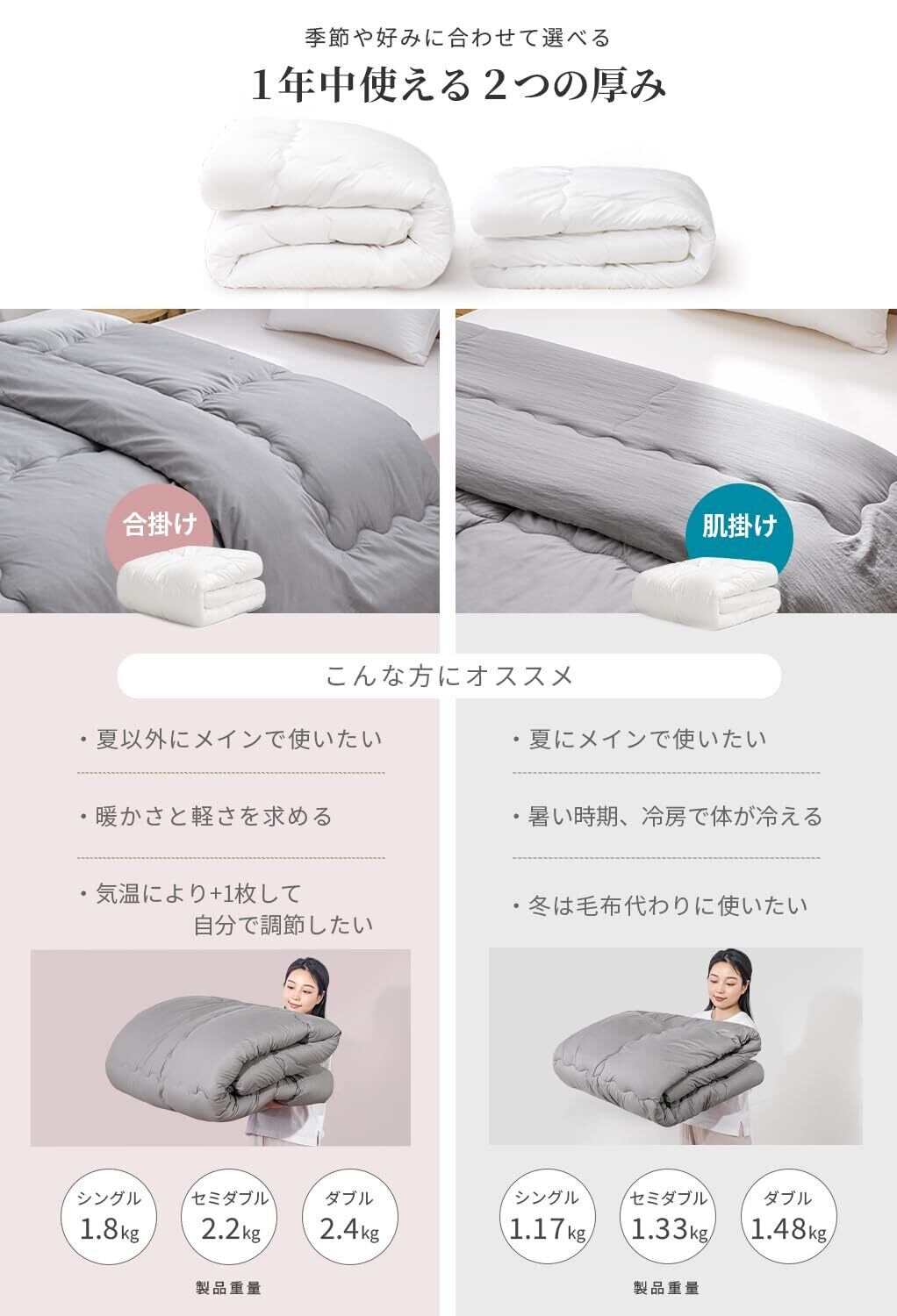 【体に優しい、ふわふわ超軽量布団】通常の掛け布団より約半分のわた量で、ふんわりと軽やかな使い心地。体にのせても圧迫感ゼロで、寝返りもスムーズ。適度な保温性で、春の肌寒い夜から初秋の涼やかな朝まで、ちょうどいい温もりをキープ。季節の変わり目に寄り添う、上質な軽やかさ。