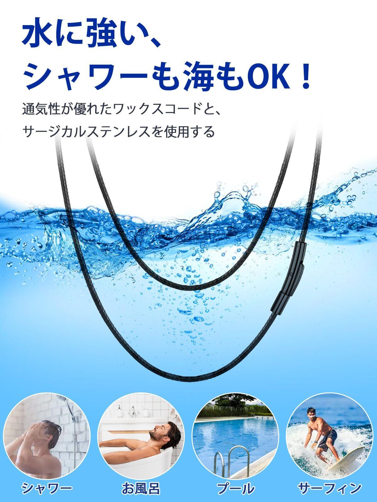 【水に強い紐ネックレス】チェーンネックレスと留め具が真っ黒のワックスコードネックレスが登場します。チェーンネックレス全体が黒で統一されているため、より調和がとれてクールな印象です。ワックスコードは革/レザーネックレスより汗や水に強く、耐久性に優れています。