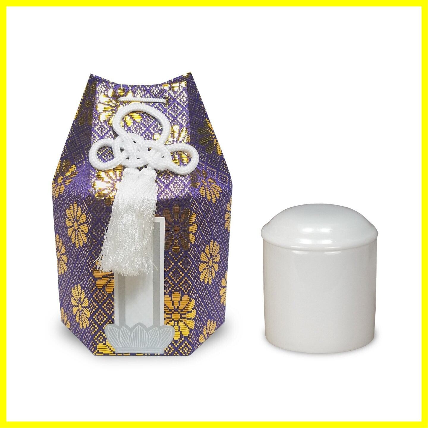 骨壺と骨袋のセットです。骨袋は、どんなお仏壇にもあう全5色。骨壺は、シンプルな白色です。