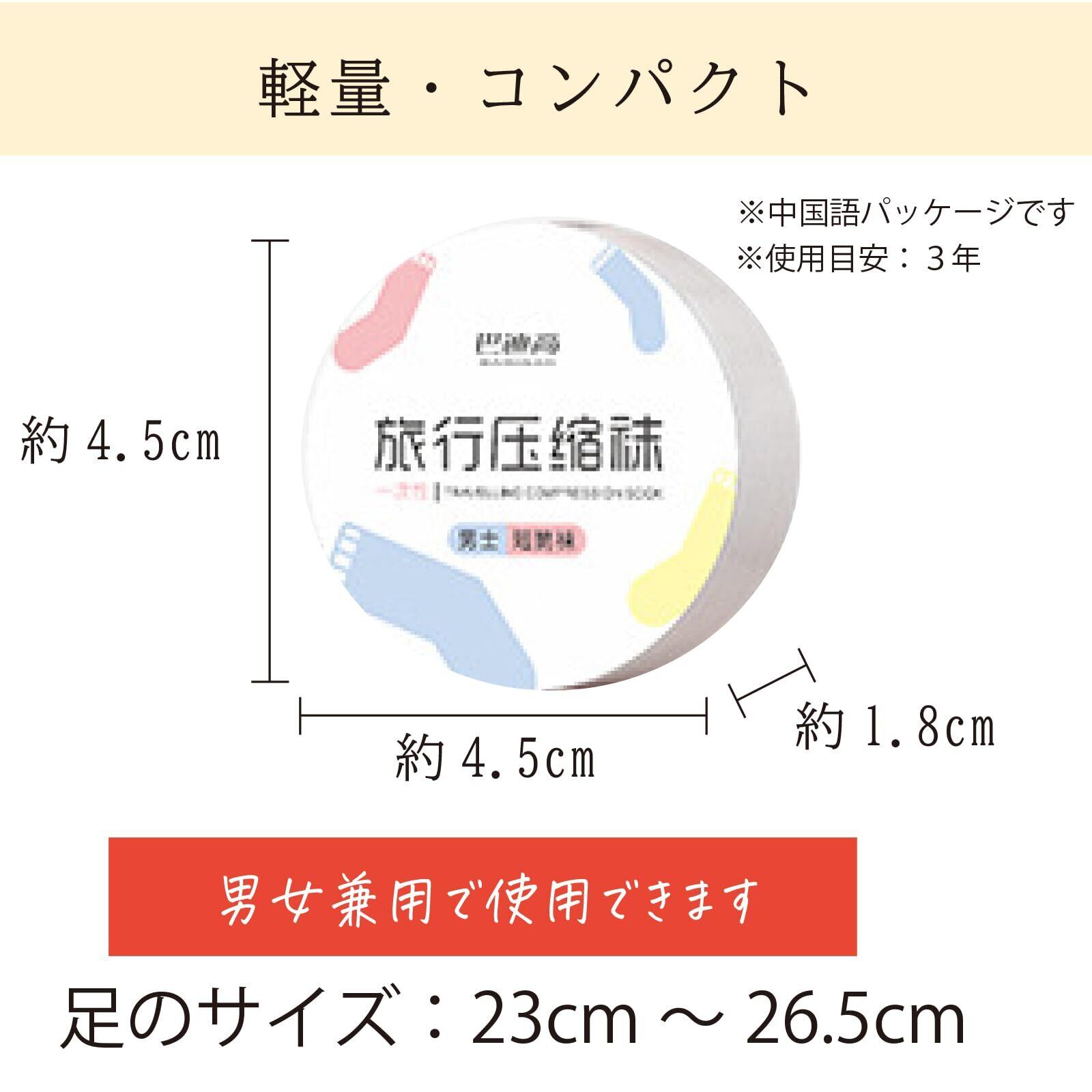 【持ち運び便利な使い捨て靴下】この靴下は、23cm~26.5cmまでのフリーサイズで、男女問わず快適に使えます。旅行やスポーツ、緊急時の避難用にも便利です。コンパクトに圧縮されているので、バッグや車に常備するのにぴったり。手でほぐすだけで簡単に使えるので、急なシーンにもすぐ対応。通気性も抜群で、季節を問わず快適な履き心地をお届けします。手軽さと清潔さで、日常や緊急時にも頼れるアイテムです