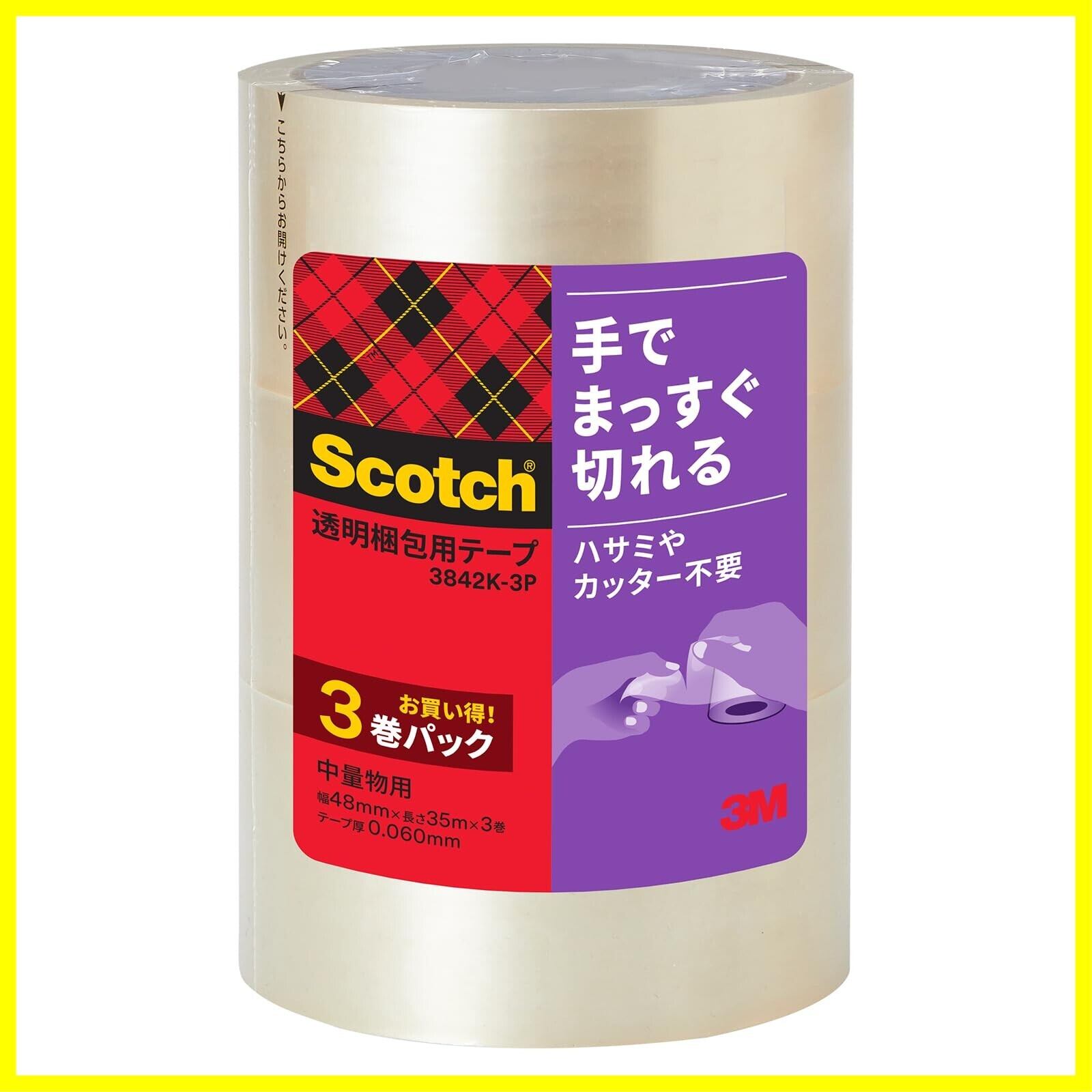 【手で切れるテープ】 3M スコッチ ガムテープ 梱包テープ 手でまっすぐ切れるテープ 48mm×35m 3842K-3P