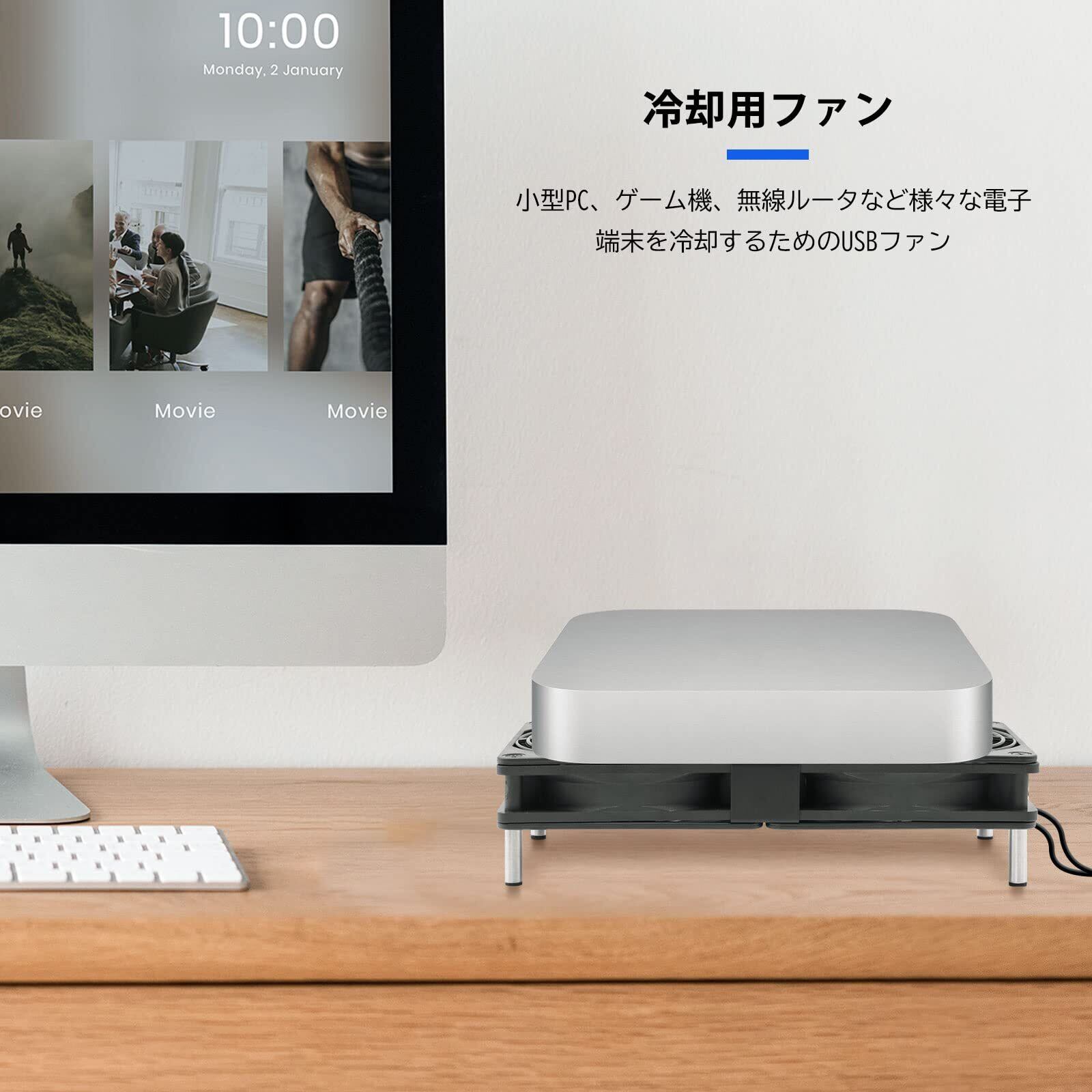 電子端末をUSB 冷却ファンに乗せて、風が下部(上部)から端末に当てるように冷却させます。空気の流れ又は熱気の排出を加速し、熱こもり現象を防ぐことができます。