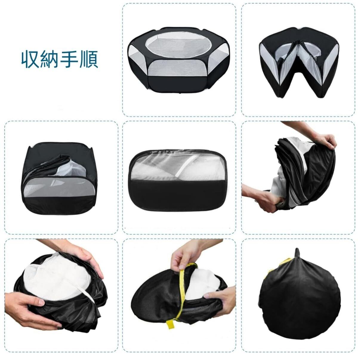 1.【製品仕様】ペットサークル本体+収納袋+固定棒3本付き、サイズ:[展開の時]約 120cm×38cm [収納の時] 約24×23×3cm、カラー:ブラック、素材:オックスフォード布+メッシュ素材。