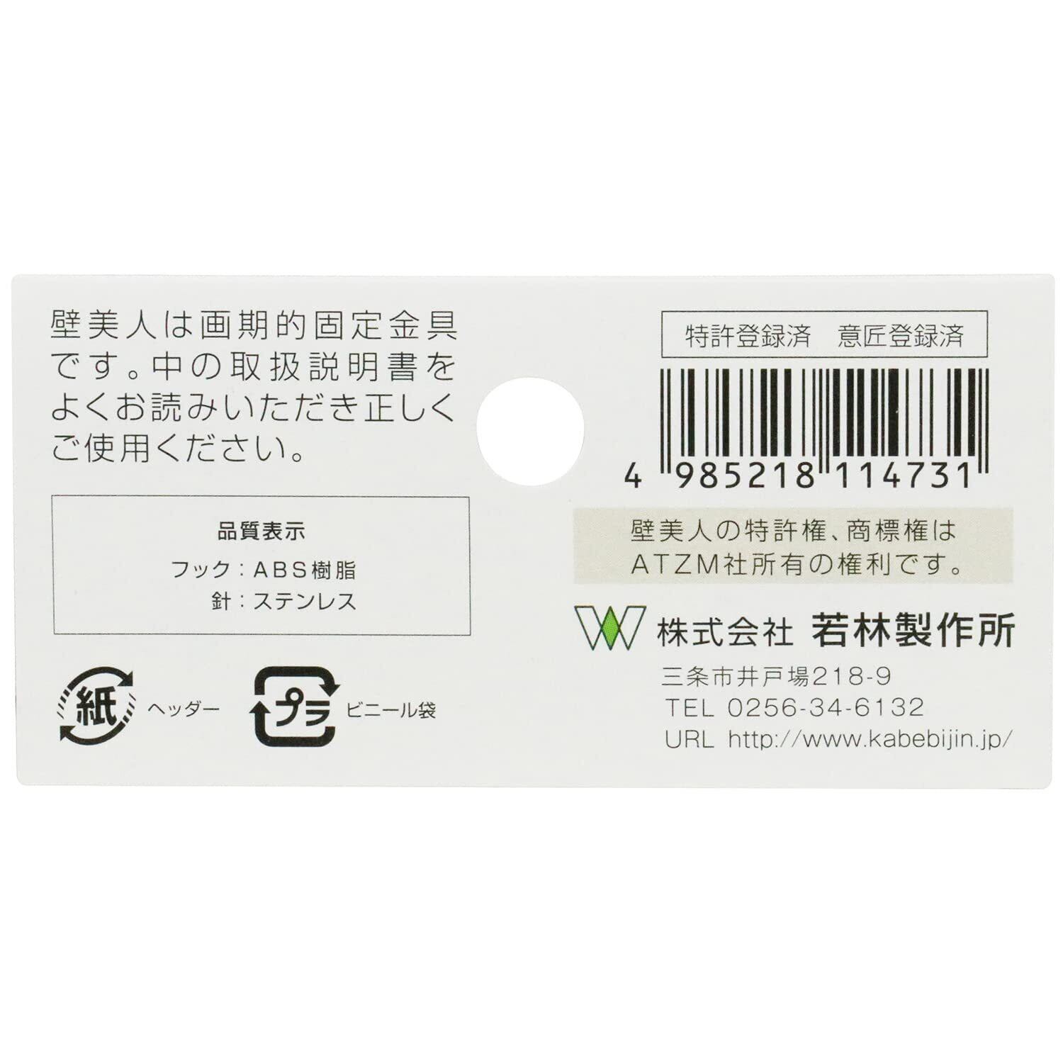 若林製作所 ABS樹脂 壁美人 時計用フック 白 2個入 CH-2 サイズ:幅36×高さ70×奥行14mm