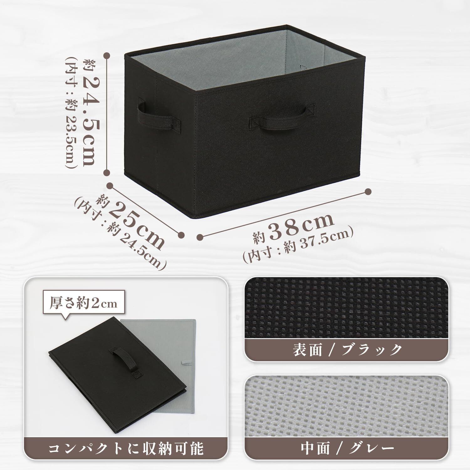 【商品仕様】:外寸/約幅38×奥行25×高さ24.5cm(内寸/約幅37.5×奥行24.5×高さ23.5cm)、カラー/ブラック×グレー、材質/ポリプロピレン・紙、内容/3個セット