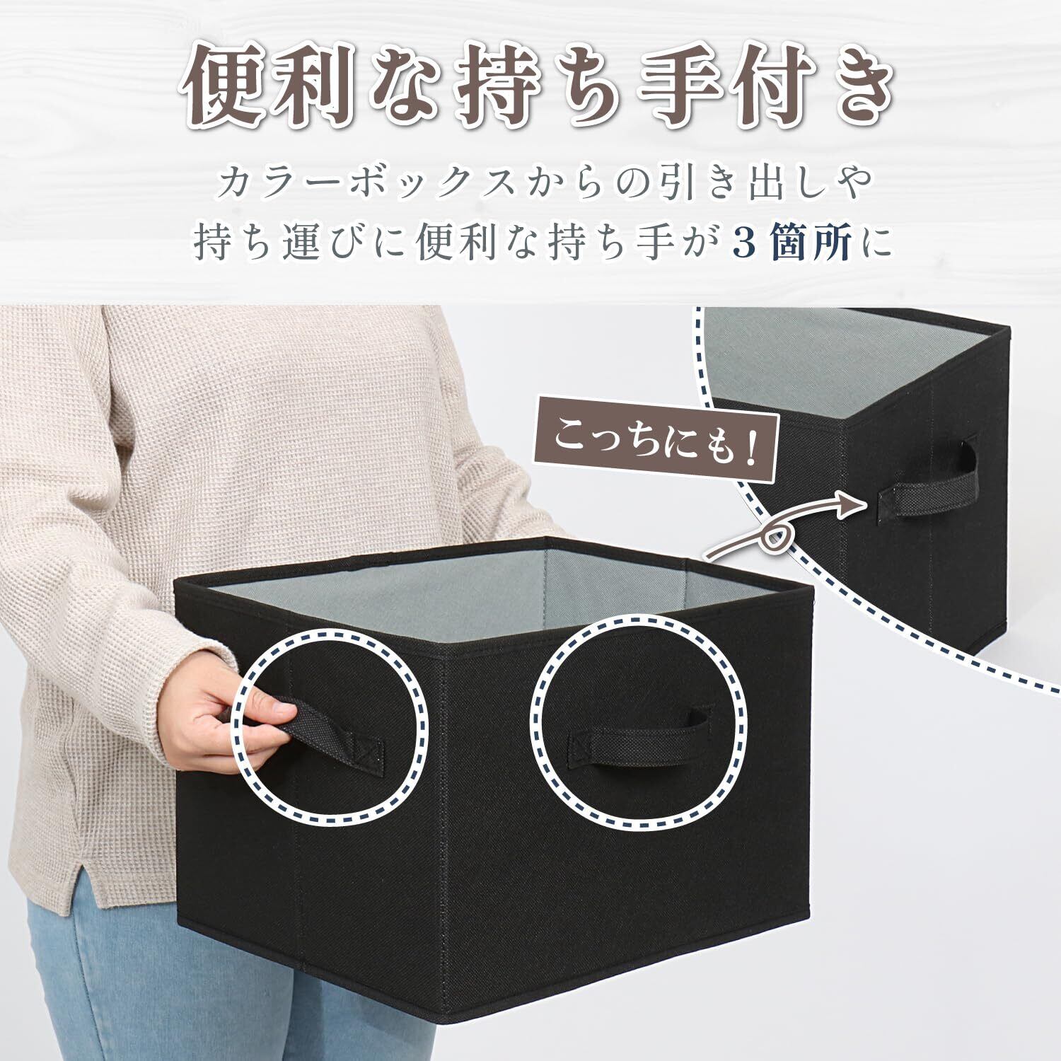 【持ち手3か所】:3か所の持ち手付きでどの面からも引き出しやすく、持ち運びやすい。ラックなどに縦向きに入れても取り出しやすい。
