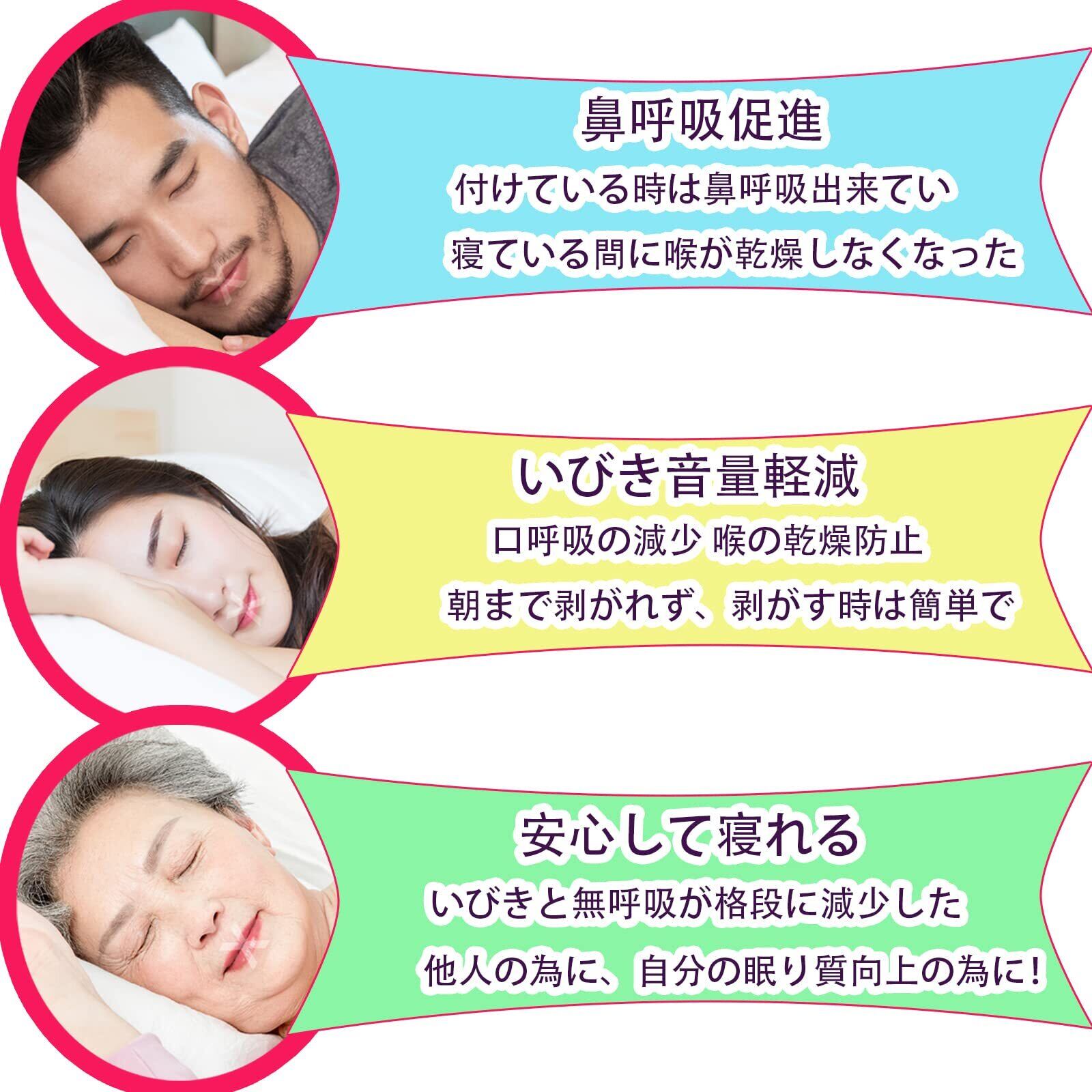 いびき音量軽減:口呼吸の減少、喉の乾燥防止、いびき音量軽減。他人の為に、自分の眠り質向上の為に!