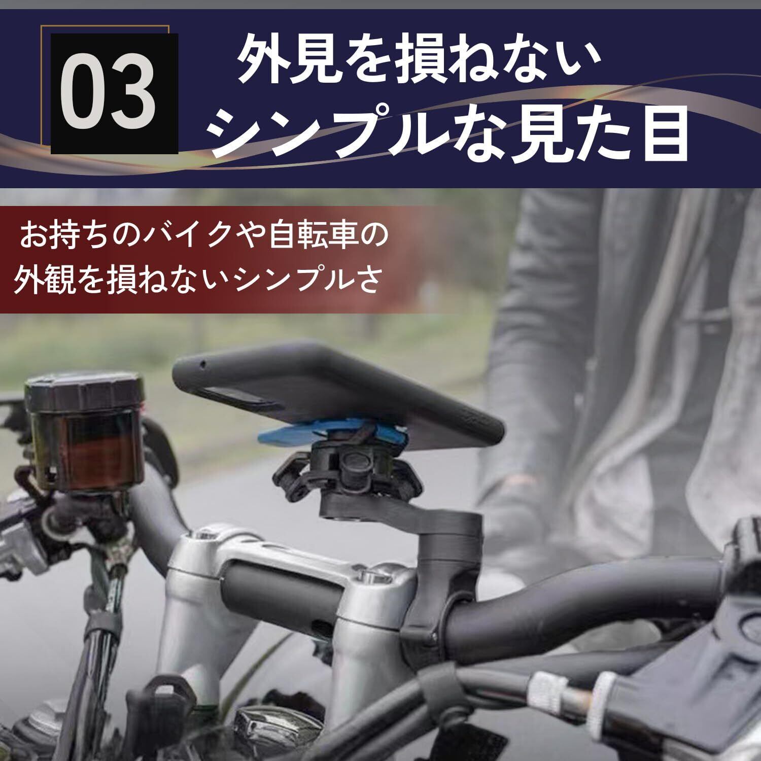 【シンプルな見た目】 スマホホルダーによくある大きなホールド部分を備えていないため、愛車の外観を損ねないシンプルな見た目となっております。ハンドルやステムのサイズが合えばどこでも取り付けられ、原付・スクーター・バイク・自転車いずれも装着可能です。