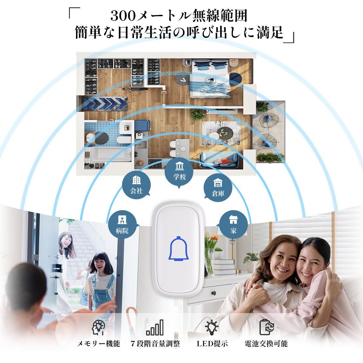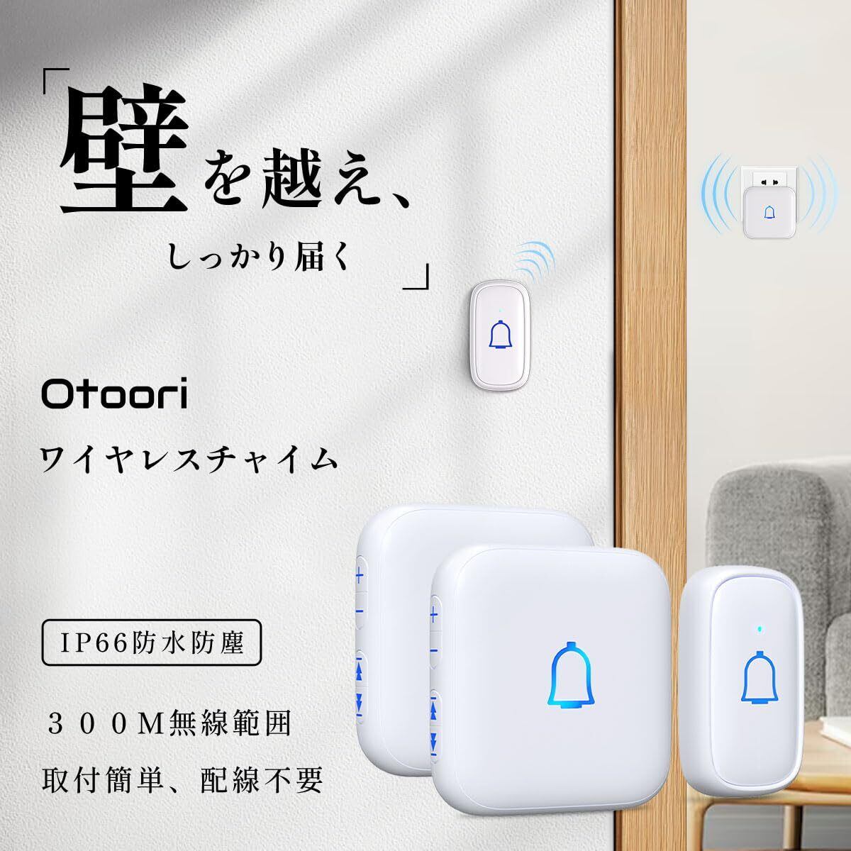 ワイヤレスチャイム IP66防水防塵 玄関チャイム 送信機電池式 受信機コンセント チャイム ワイヤレス ドアベル 呼び鈴 工事不要 300M無線範囲 音と光で呼び出し 簡易チャイム 大音量 メモリ機能 60種以上チャイム音 LED提示 7段階音量調節 増設可能 無線 玄関 室内 (1送信機+2受信機)