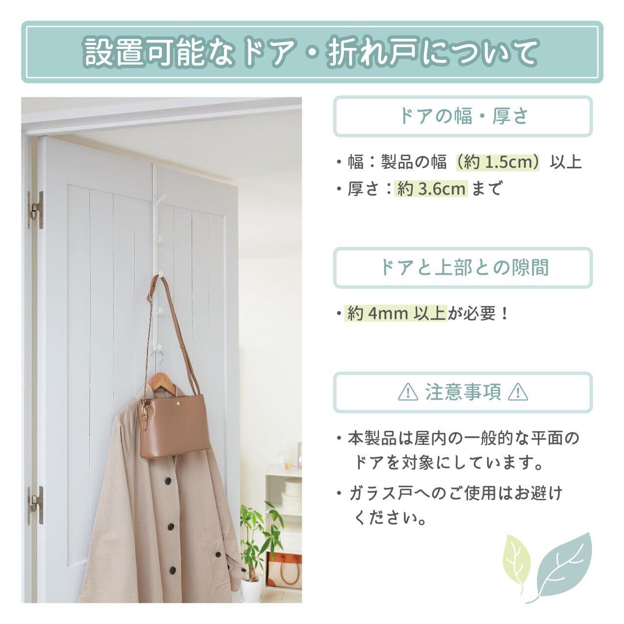 設置可能なドア / ドアの幅:製品の幅(約1.5cm)以上、ドアの厚さ:約3.6cmまで、ドアと上部との隙間:約4mm以上が必要です。