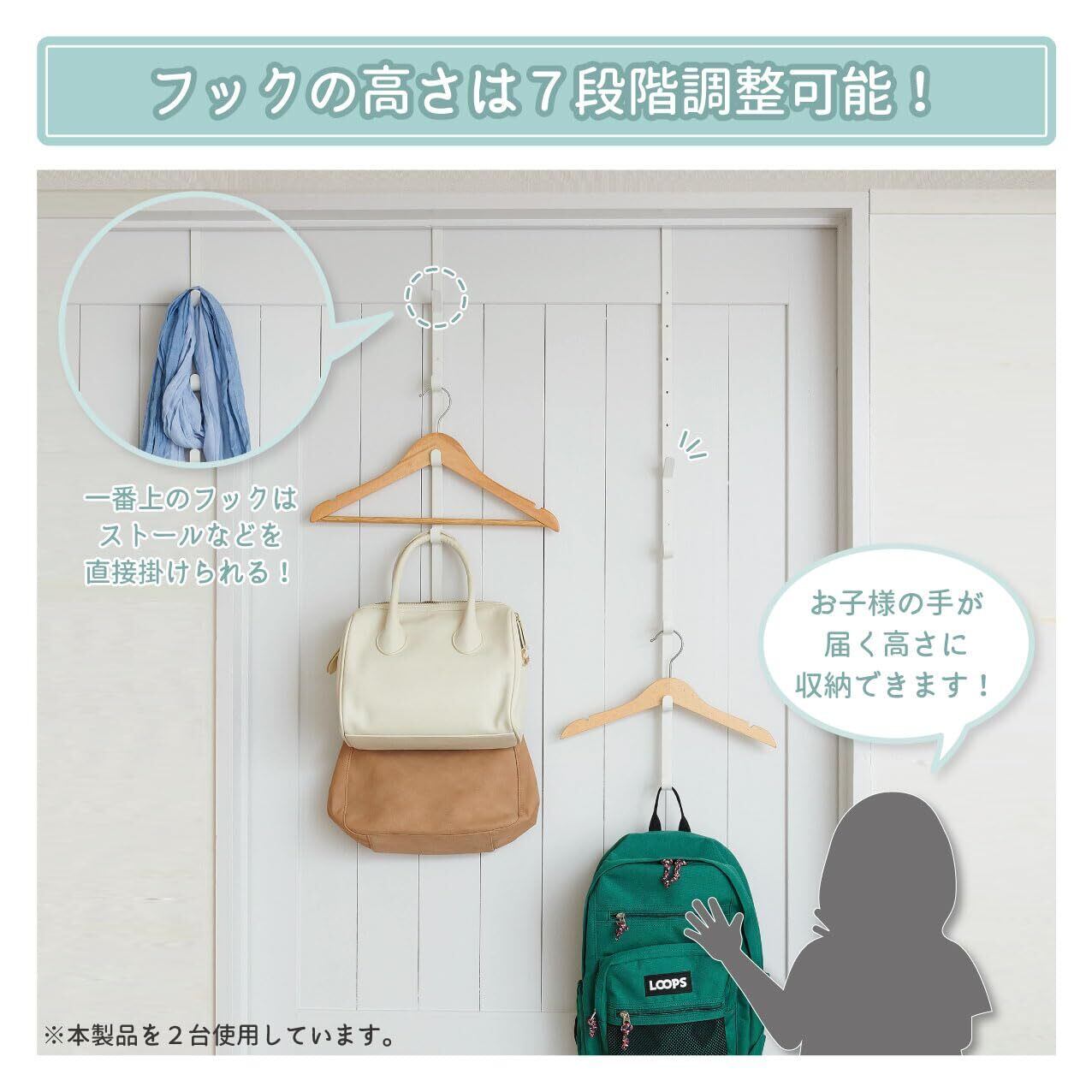 ・高さを5cm間隔で7段階に調整可能。下のフックはお子様の手が届く高さで収納でき、上のフックは大人の帽子やバッグなどを掛けると便利に収納できます。