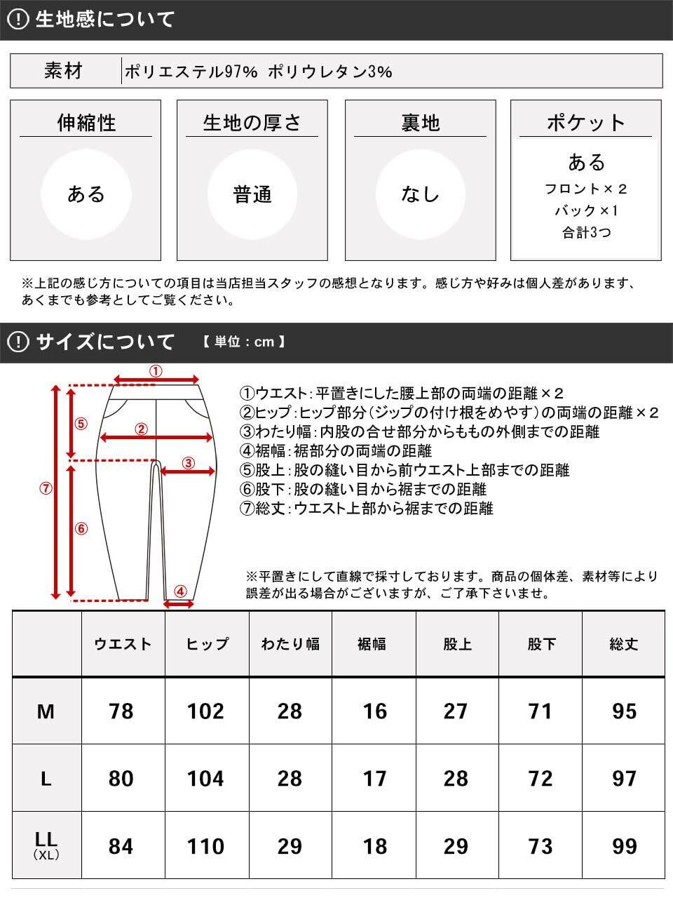 Mサイズ= ウエスト78cm ヒップ102cm わたり幅28cm 裾幅16cm 股上27cm 股下71cm 総丈95cm (下札表示対応サイズ)ウエスト76~84cm