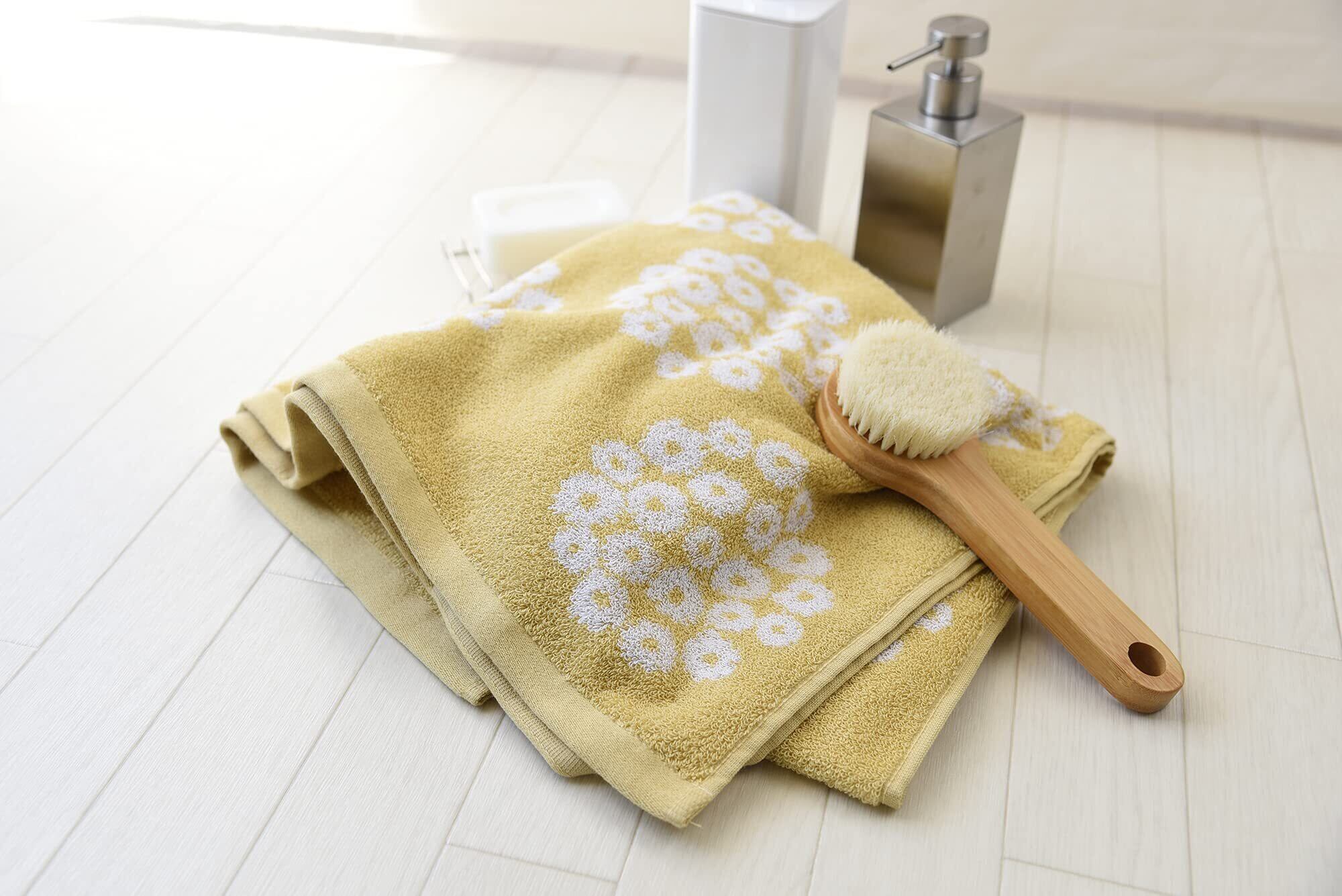 「花束」をモチーフにつくられたデザイン。少しくすんだ色合いが優しいイメージとぴったりです。普通の糸より、撚りが甘いあま撚り糸を使った、ふんわりと肌触りのやさしいタオルです。