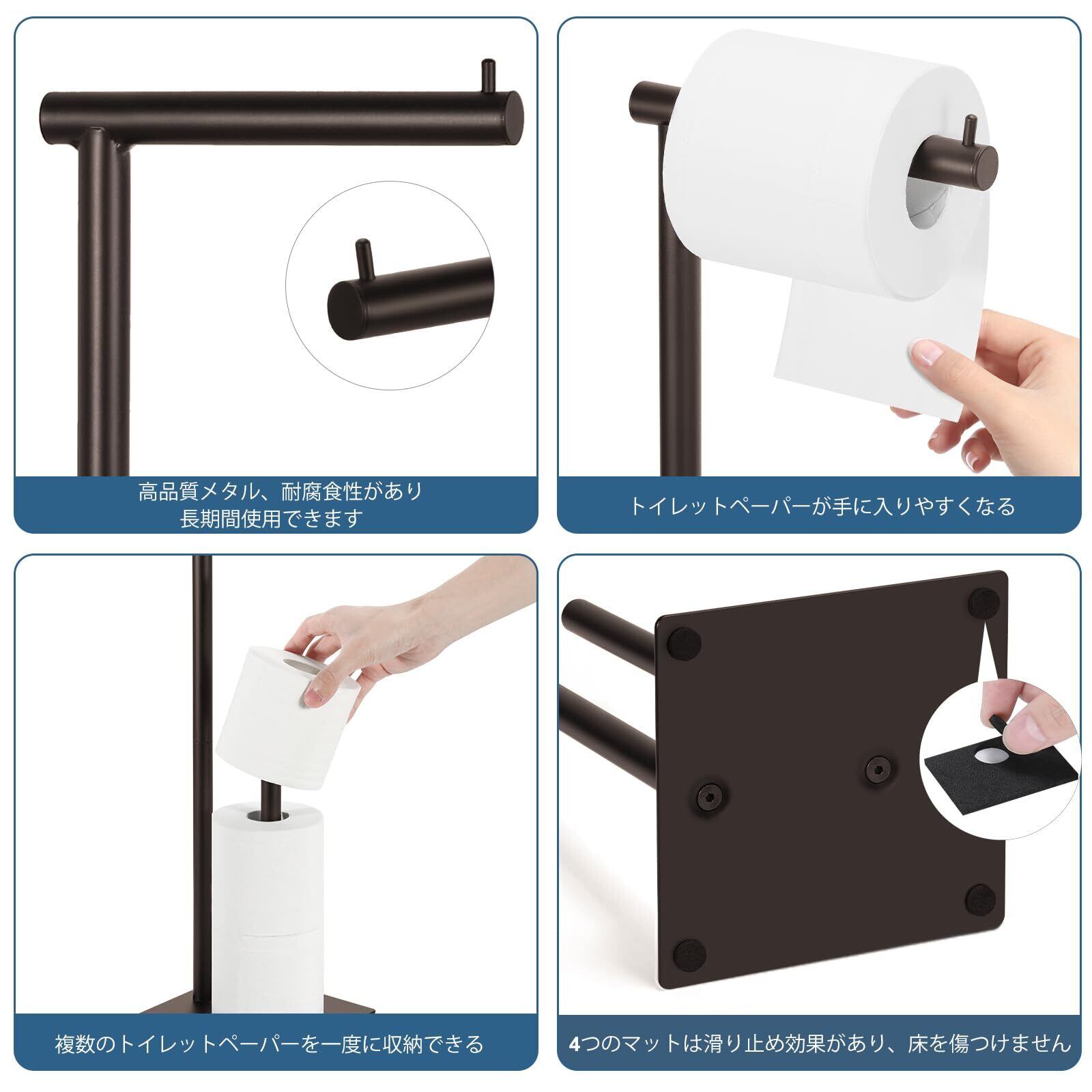 【安定性】トイレットペーパースタンドはしっかりした構造で、簡単には崩れません、ベースは四角形の金属ベースで、トイレットペーパーホルダーは全体的により安定しており、トイレットペーパーを置いたときに倒れません、ご自由にお使いください。