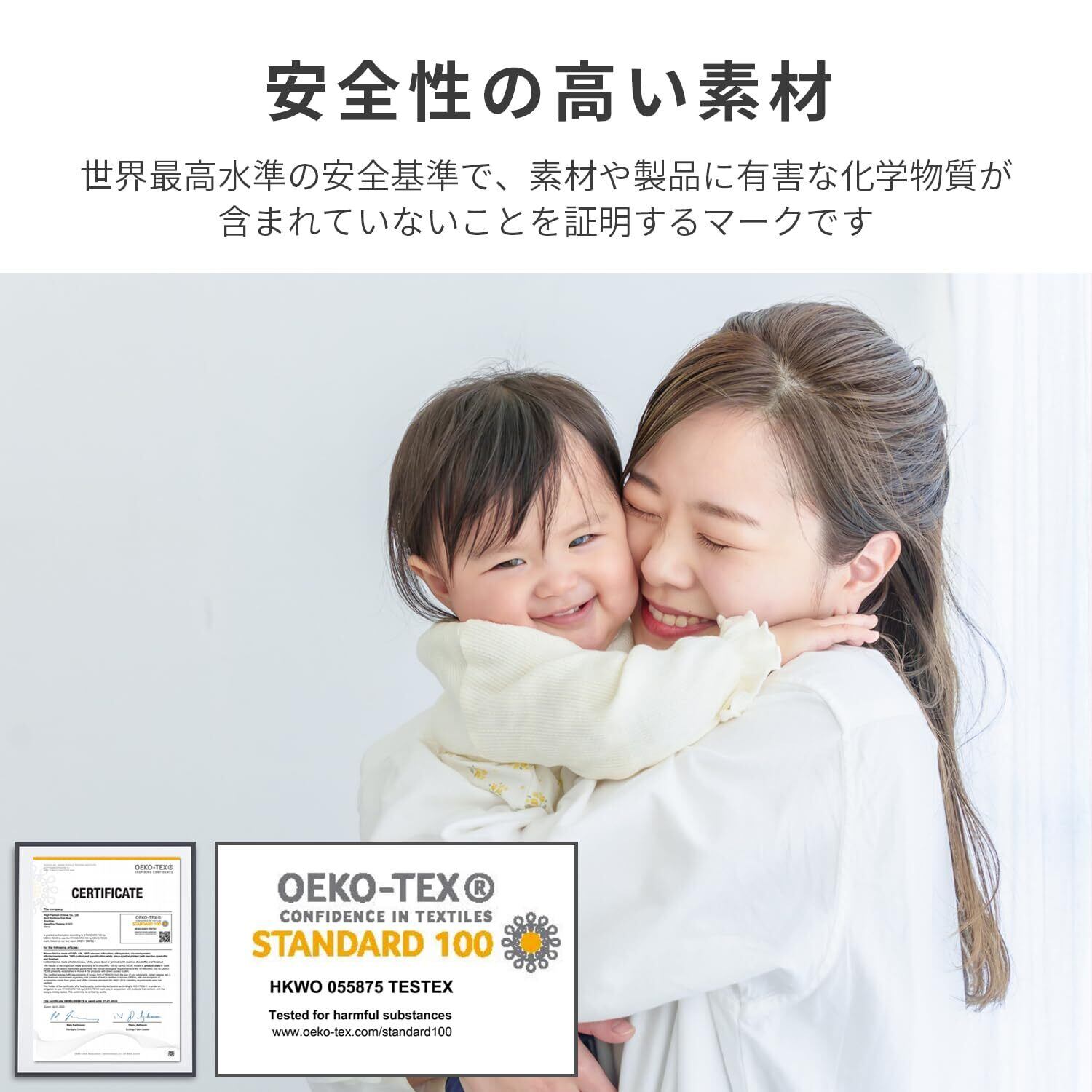 <安全の認証マーク>:300種類以上の有害物質を対象とした、世界最高水準の安全な繊維製品の証 「エコテックススタンダード100」認証を取得。