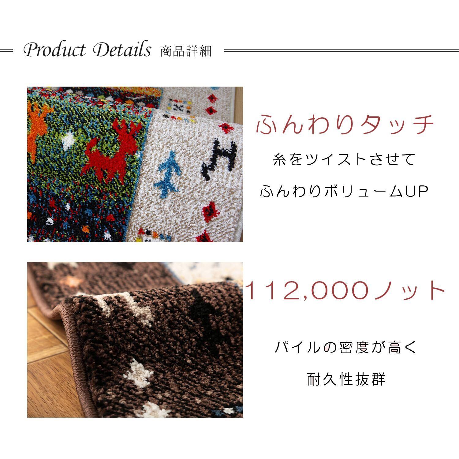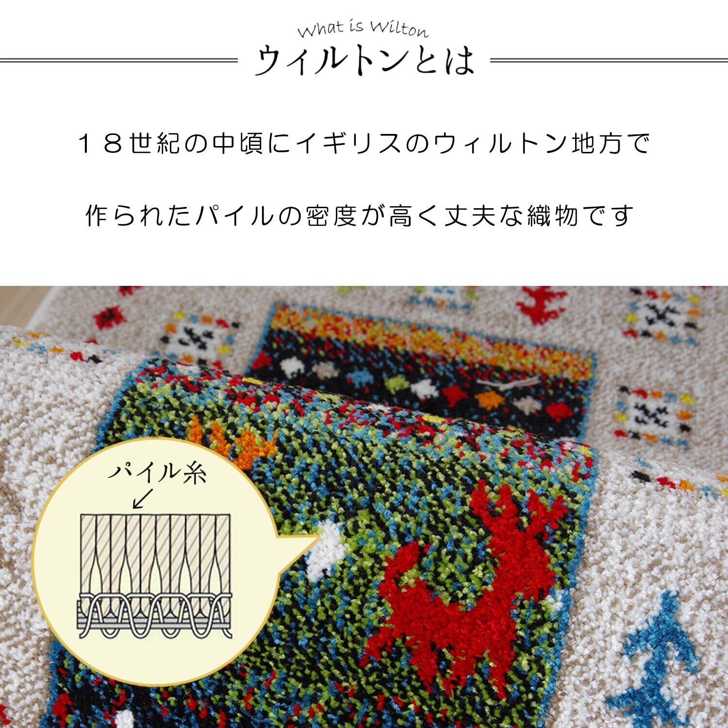 ウィルトン織りは非常に耐久性の高い織物です。家の中でも靴を履いて生活するヨーロッパで、土足で扱うことを前提として作られておりますので、長時間踏みつけてもヘタリにくく、弾力性もあり長くご使用頂けます。本商品の『繊維の密度を表すノット数』は112,000ノットです。